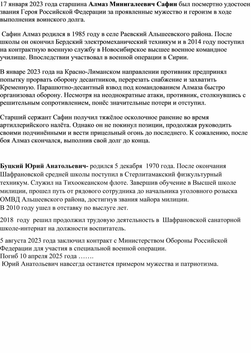 17 января 2023 года старшина Алмаз Минигалеевич Сафин был посмертно удостоен звания Героя Российской Федерации за проявленные мужество и героизм в ходе выполнения воинского долга.