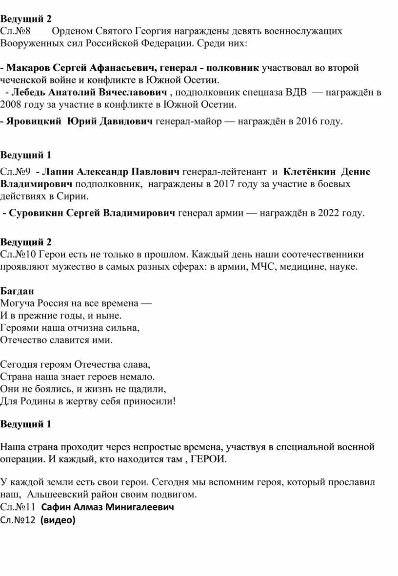 Сл.№8 Орденом Святого Георгия награждены девять военнослужащих Вооруженных сил Российской Федерации. Среди них: