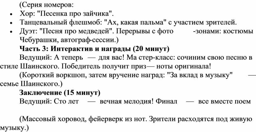 Юбилейное мероприятие "Сто лет волшебства" — это не просто концерт, а настоящее путешествие во времени. Мы пригласим звезд, которые исполняли его хиты: от современных поп-исполнителей до фольклорных коллективов. Будут показы архивных видео, мастер-классы по сочинению песен и даже интерактив для детей — чтобы новое поколение узнало Шаинского. Представьте: зал полон, звучит оркестр, и все подпевают "Песенке про зайчика".