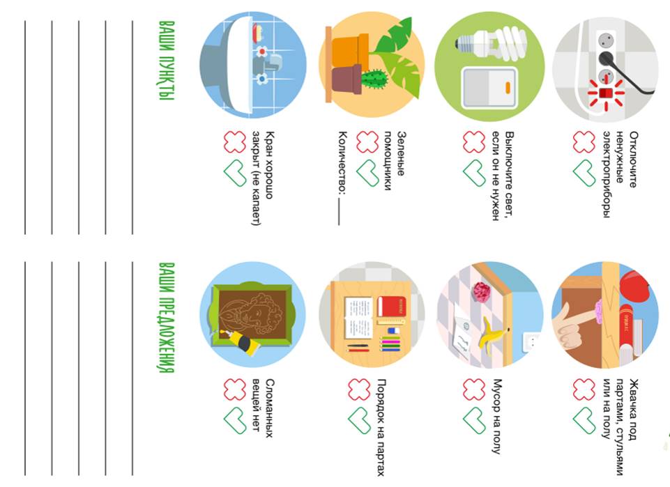 - Давайте договоримся, что не будем бросать мусор, где попало, не будем оставлять его в лесу, на речке, а будем выбрасывать его в урны, мусорные ведра, контейнеры. - Как сделать так, чтобы мусора было меньше? Давайте сейчас составим свод правил: Слайд 17 Во-первых, нужно относиться к вещам бережно, как к своим, так и к чужим: заботиться о них, стараться не ломать и не терять. Ведь сломанные вещи отправятся на свалку, вред от которой распространяется на всех жителей города. Меньше мусора — меньше вреда. Во-вторых, не все сломанные вещи должны сразу же отправляться в мусорное ведро. Многие из них можно починить и еще долго ими пользоваться. В-третьих, ненужными, но еще хорошими вещами всегда можно поделиться. Наверняка рядом с вами найдутся люди, которым эти вещи пригодятся. Например, одежда, из которой вы выросли, или игрушки, в которые вы больше не играете, могут очень порадовать соседских малышей и их родителей. Ну и в-четвертых, важно пользоваться многоразовыми вещами вместо одноразовых. Вокруг нас огромное количество одноразовых вещей, которые очень быстро превращаются в мусор. Это еще одна отличная задачка для изобретателей: подыскать им многоразовую замену. Например, при походе в магазин можно брать с собой многоразовую сумку, а не использовать пластиковый пакет, который сразу же отправится в мусорное ведро. Многоразовую бутылку для воды просто и удобно носить с собой, чтобы не пользоваться одноразовыми стаканчиками и бутылками. -А теперь представьте ваши работы. -Ура! Мы успешно потрудились, но я предлагаю посмотреть вокруг. Ребята, давайте проверим, все ли хорошо у нас в классе или мы могли бы что-то улучшить. Каждая группа проведет свое исследование и подготовит предложения о том, что можно было бы изменить, чтобы наш класс стал прекраснее, и мы могли бы чувствовать себя в нем лучше. Я раздам вам бланки, которые помогут выполнить задание. Напротив каждого пункта поставьте зеленые галочки, если все в порядке, или красные крестики, если обнаружите непорядок. Вы можете дописать свои пункты, если вам покажется, что чего-то не хватает. (Приложение 1) Слайд 18 |