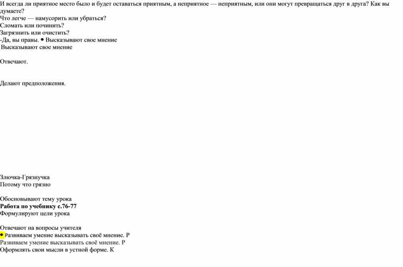 -Посмотрите на эти рисунки. Слайд 2 -Какой населенный пункт вам больше нравится? В каком вам хотелось бы жить? -Представьте, что вы оказались в первом населенном пункте. Как бы вы себя чувствовали? -А теперь представьте, что вы во втором? Как вам здесь? -Попробуйте угадать, в каком населенном пункте живут эти люди и как они себя чувствуют. Слайд 3 -То, что нас окружает, влияет на наше настроение и самочувствие. В красивых, чистых местах мы часто чувствуем себя хорошо и радостно, нам приятно в них находиться, настроение улучшается. А в грязных и некрасивых, настроение может испортиться — в них находиться неприятно, грустно или даже страшно. Правда ведь? Отсутствие чистоты и красоты приносит людям неприятности: они могут заболеть, у них портится настроение, они начинают ссориться, ругаться, быстро устают, грустят и причиняют вред окружающей среде. Слайд 4. Щелчок по слайду -Но посмотрите, в грязном населенном пункте появился радостный житель. Как бы вы его или ее назвали? Почему этот житель появился именно здесь? -Правильно, потому что там грязно. -Скажите, а о чем сегодня пойдет речь на уроке? Работа по учебнику с.76-77 -Прочитайте тему урока на странице 78. Слайд 5 -Какие цели мы для себя поставим? -Так откуда же берутся «хорошие» и «нехорошие» места? И всегда ли приятное место было и будет оставаться приятным, а неприятное — неприятным, или они могут превращаться друг в друга? Как вы думаете? Что легче — намусорить или убраться? Сломать или починить? Загрязнить или очистить? -Да, вы правы. |