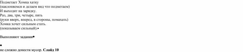 Хомка-хомка, хомячок. (надуваем щеки как хомяк) Полосатенький бочок. (гладим себя по бокам) Хомка раненько встает, (потягиваемся) (делаем соответсвенные действия) Подметает Хомка хатку (наклоняемся и делаем вид что подметаем) И выходит на зарядку. (руки вверх, вперед, в стороны, помахать) (показываем сильный). |