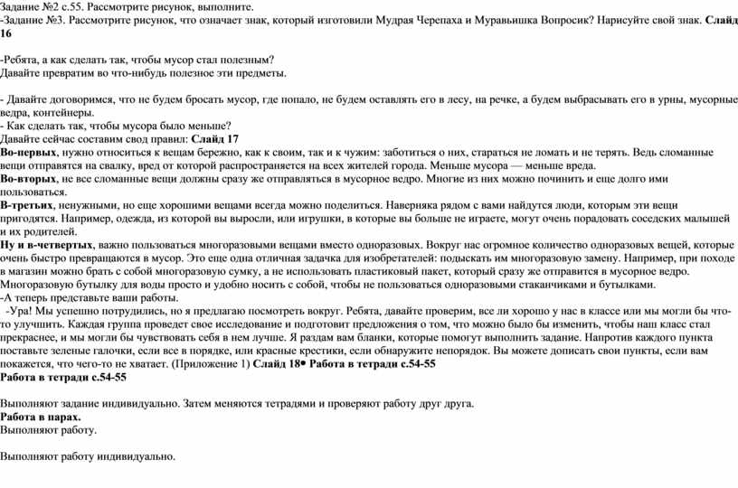Работа в парах -Предлагаю поработать в парах. Что лишнее на картинке? Задание №2 с.55. Рассмотрите рисунок, выполните. -Задание №3. Рассмотрите рисунок, что означает знак, который изготовили Мудрая Черепаха и Муравьишка Вопросик? Нарисуйте свой знак. Слайд 16