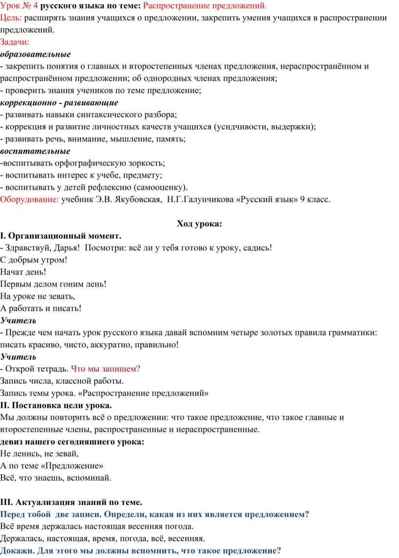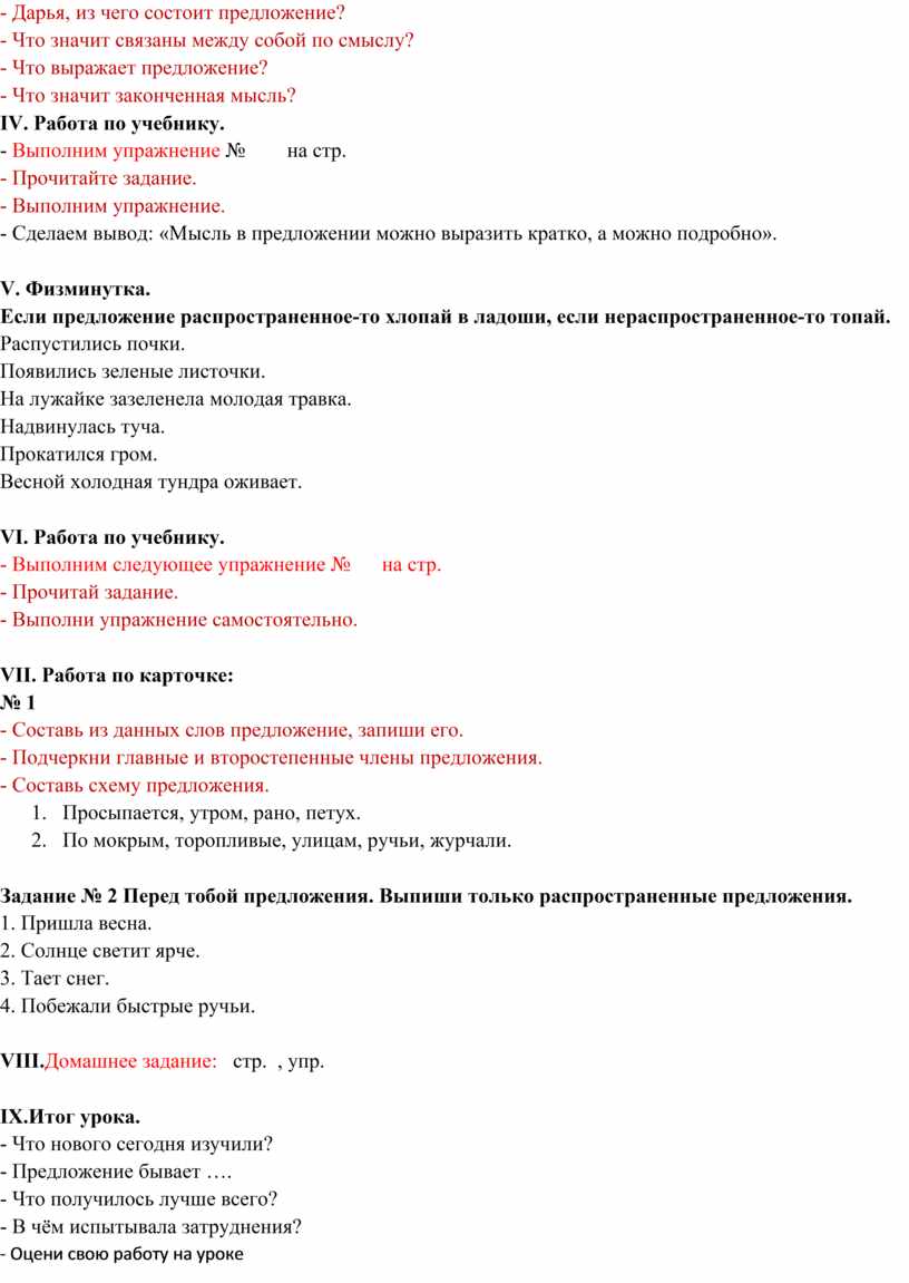 - закрепить понятия о главных и второстепенных членах предложения, нераспространённом и распространённом предложении; об однородных членах предложения;