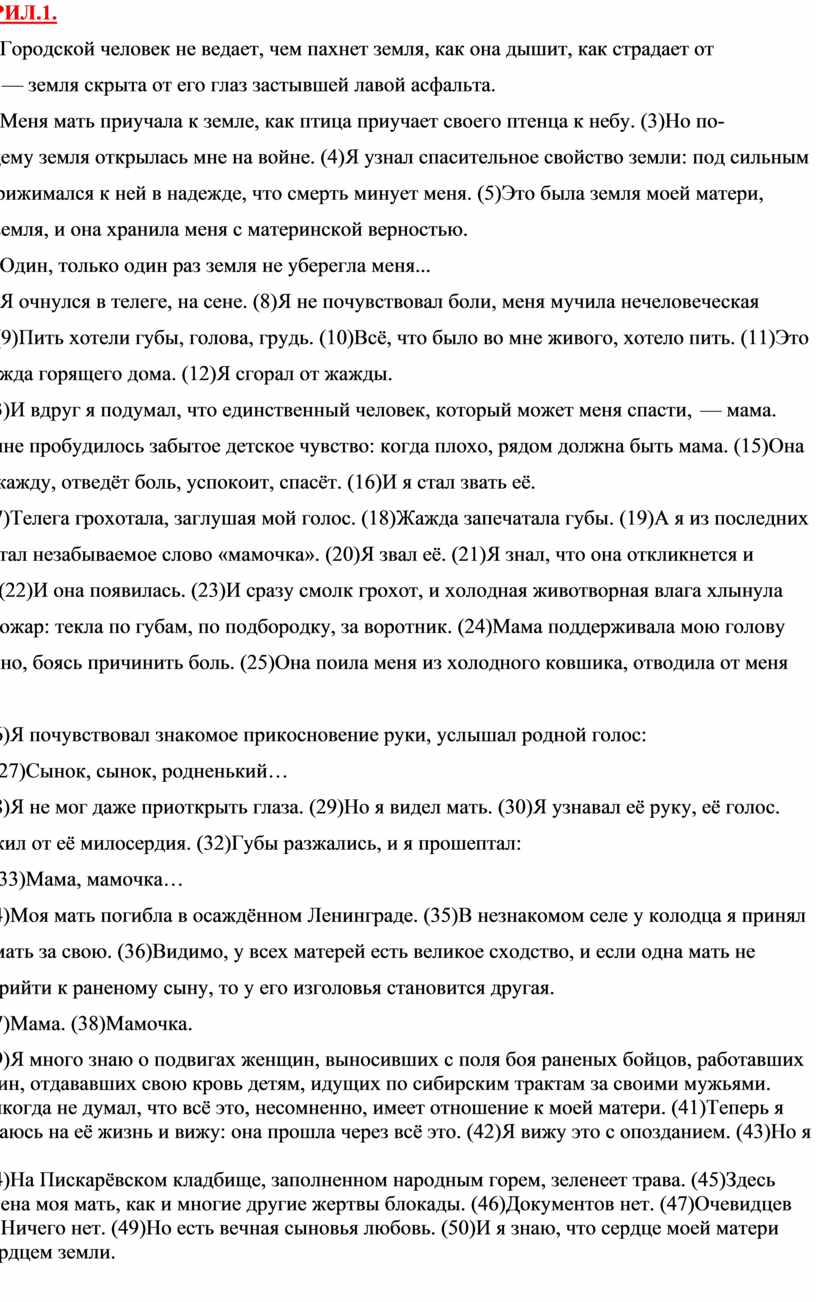 (44)На Пискарёвском кладбище, заполненном народным горем, зеленеет трава. (45)Здесь похоронена моя мать, как и многие другие жертвы блокады. (46)Документов нет. (47)Очевидцев нет. (48)Ничего нет. (49)Но есть вечная сыновья любовь. (50)И я знаю, что сердце моей матери стало сердцем земли.