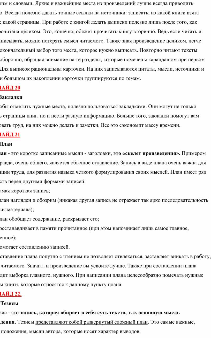 При этом разбивают текст на отрывки. Далее находят в каждой части главное и кратко формулируют мысль. Это и будут тезисы. В тезисах опять же целесообразно указывать нужные страницы.