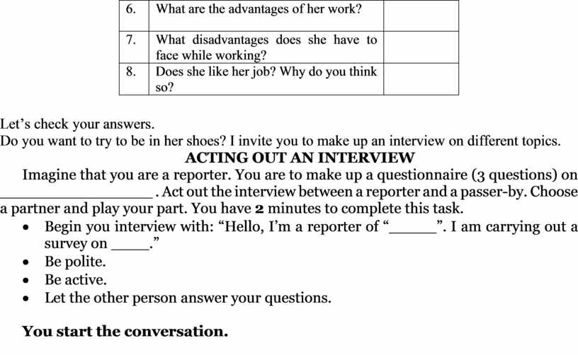 Do you want to try to be in her shoes? I invite you to make up an interview on different topics.