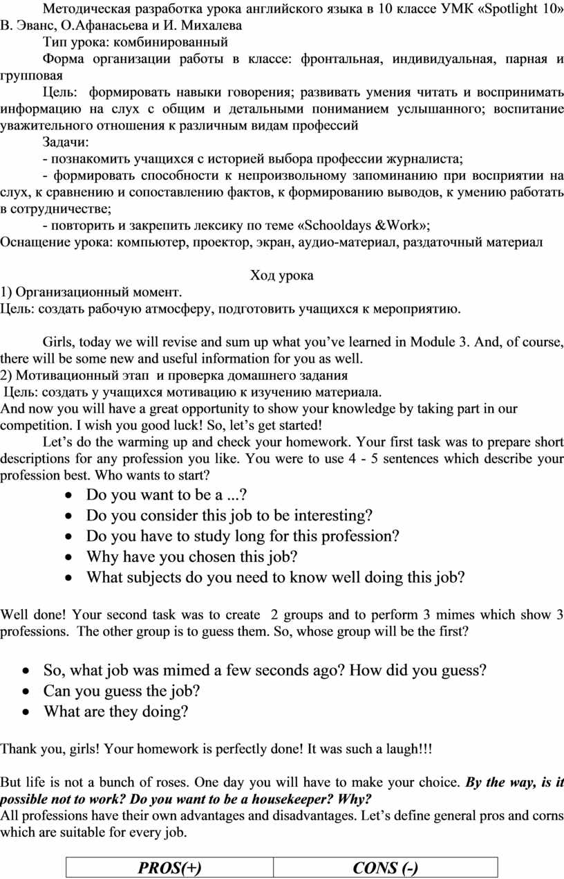 Методическая разработка урока английского языка в 10 классе УМК «Spotlight 10» В. Эванс, О.Афанасьева и И. Михалева
