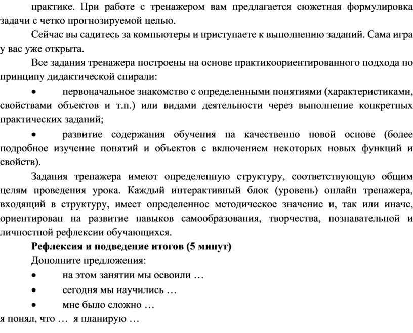Задания тренажера имеют определенную структуру, соответствующую общим целям проведения урока. Каждый интерактивный блок (уровень) онлайн тренажера, входящий в структуру, имеет определенное методическое значение и, так или иначе, ориентирован на развитие навыков самообразования, творчества, познавательной и личностной рефлексии обучающихся.