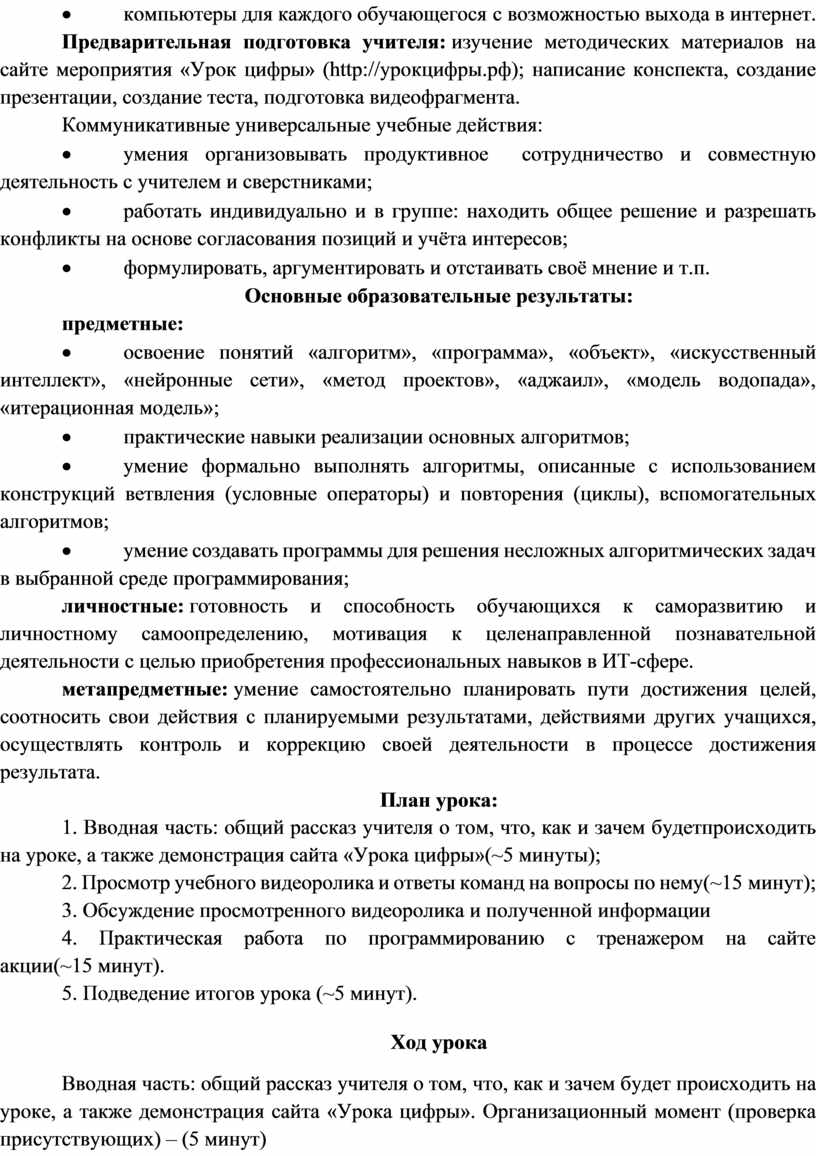 Предварительная подготовка учителя: изучение методических материалов на сайте мероприятия «Урок цифры» (http://урокцифры.рф); написание конспекта, создание презентации, создание теста, подготовка видеофрагмента.