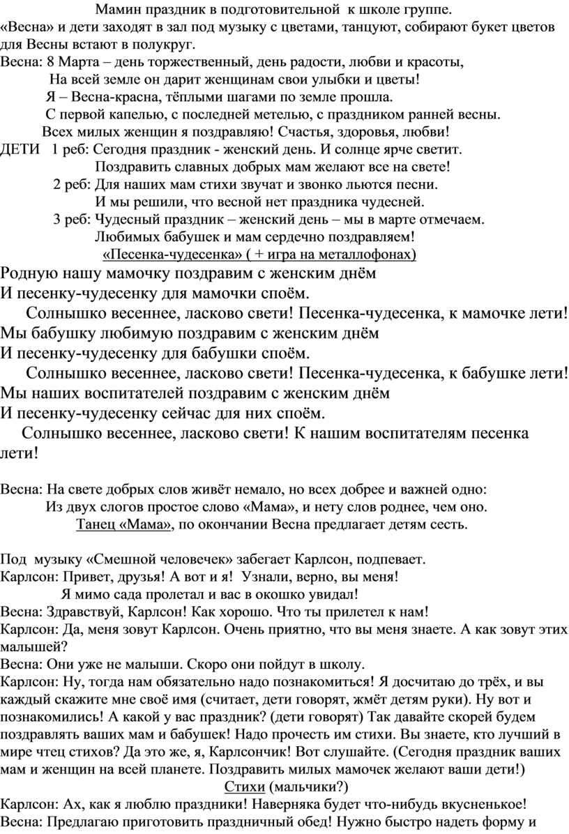 Карлсон: Ну, тогда нам обязательно надо познакомиться! Я досчитаю до трёх, и вы каждый скажите мне своё имя (считает, дети говорят, жмёт детям руки). Ну вот и познакомились! А какой у вас праздник? (дети говорят) Так давайте скорей будем поздравлять ваших мам и бабушек! Надо прочесть им стихи. Вы знаете, кто лучший в мире чтец стихов? Да это же, я, Карлсончик! Вот слушайте. (Сегодня праздник ваших мам и женщин на всей планете. Поздравить милых мамочек желают ваши дети!)