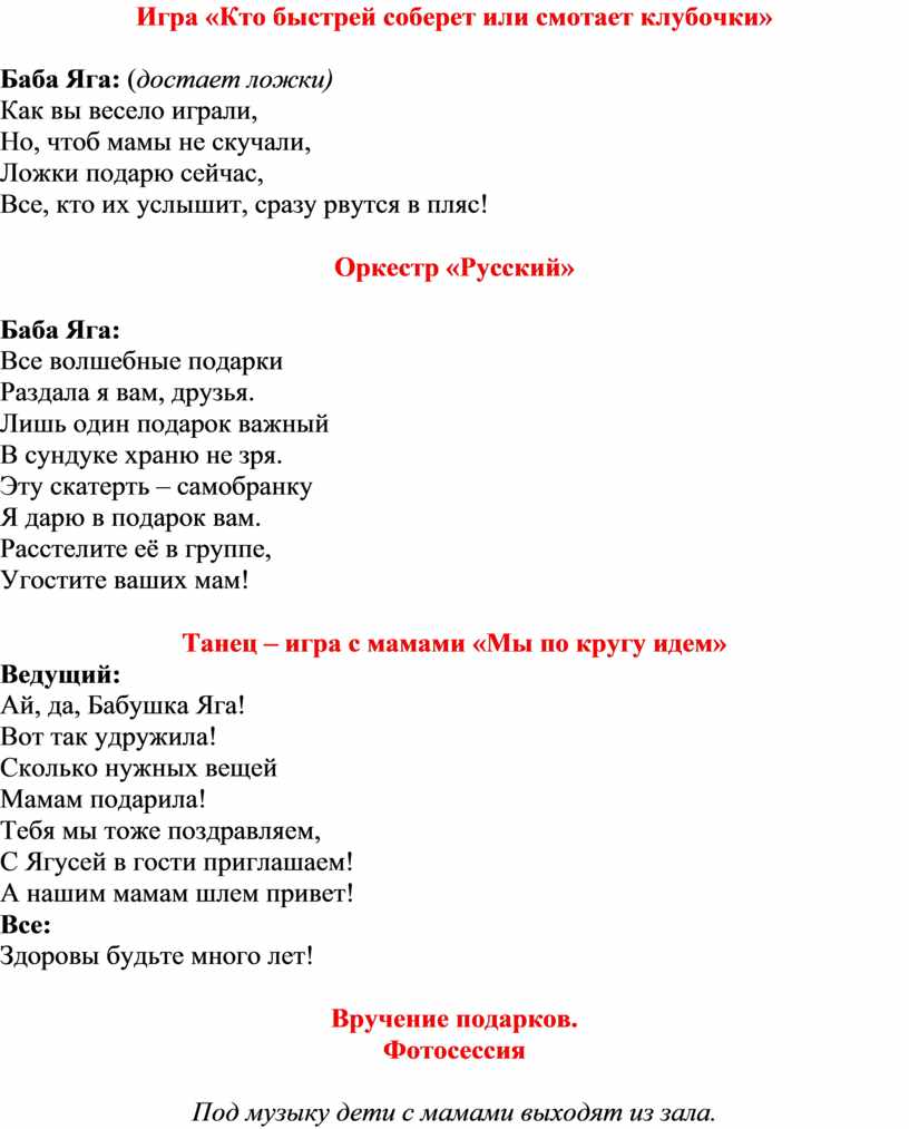 Баба Яга: Ой, голубчики, как это вы хорошо про мамочку вспомнили. Я как стихи, да песню услыхала, так прослезилась, так расчувствовалась, что решила к вам на праздник заглянуть.
