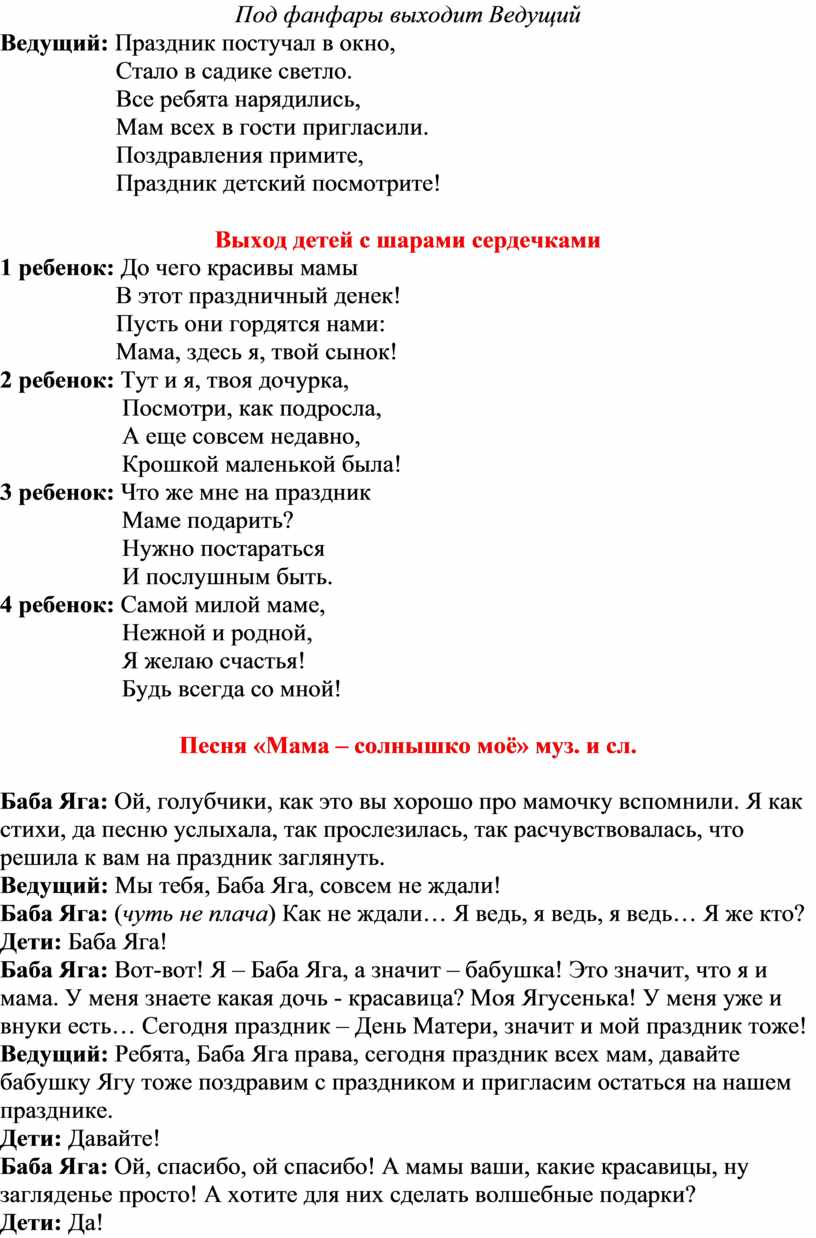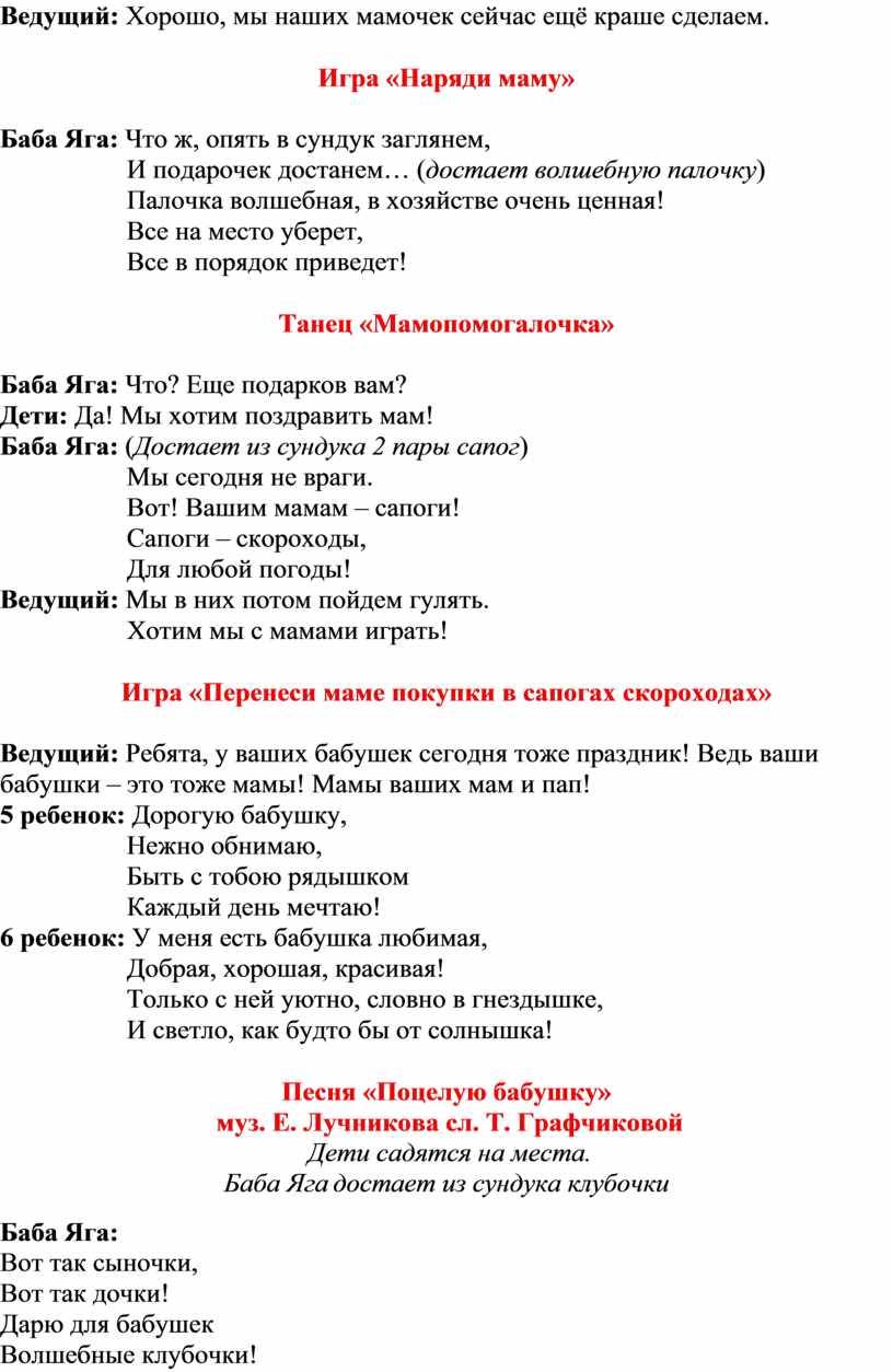 Ведущий: Ребята, Баба Яга права, сегодня праздник всех мам, давайте бабушку Ягу тоже поздравим с праздником и пригласим остаться на нашем празднике.
