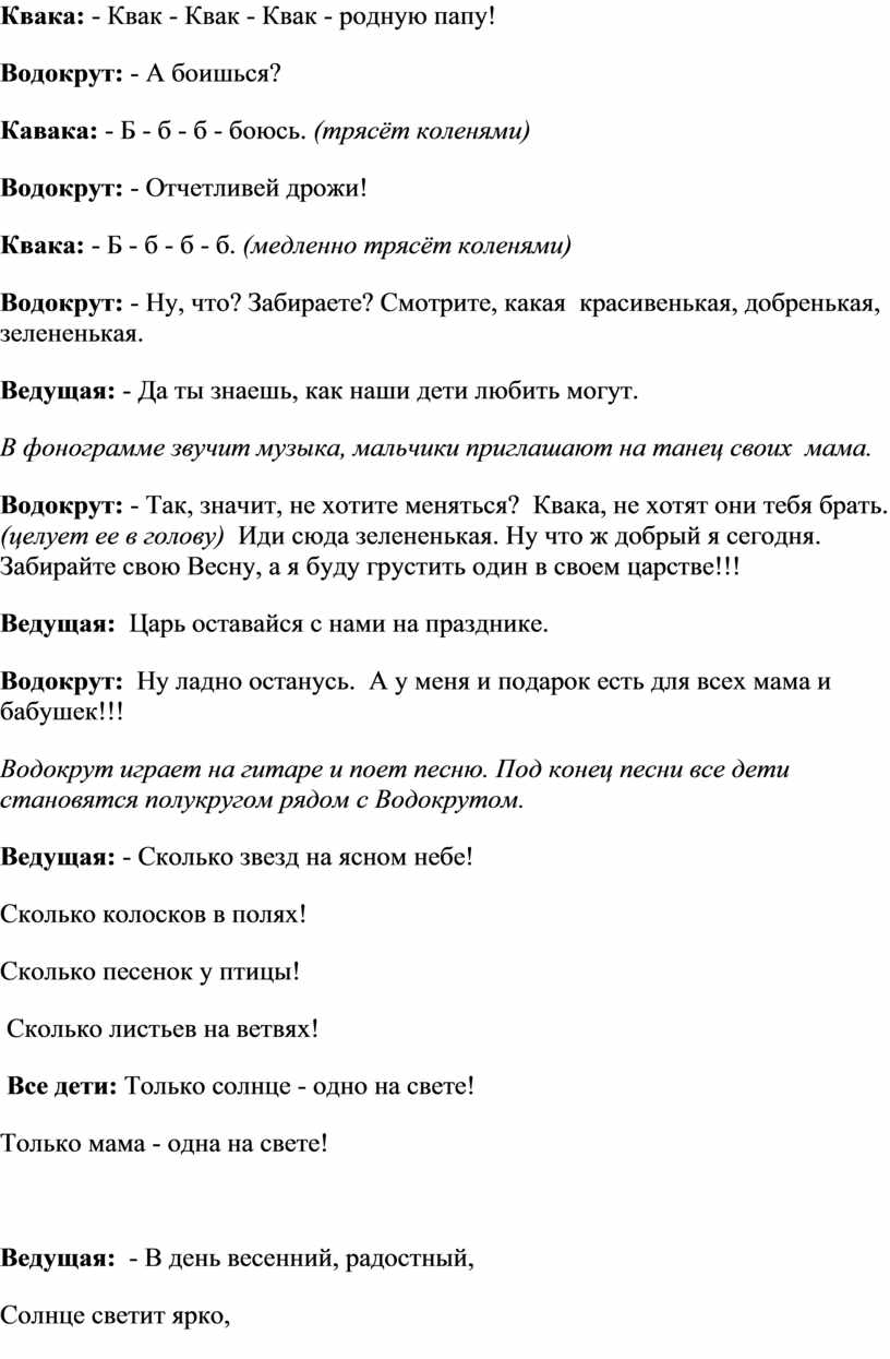 Водокрут: - Так, значит, не хотите меняться? Квака, не хотят они тебя брать. (целует ее в голову) Иди сюда зелененькая. Ну что ж добрый я сегодня. Забирайте свою Весну, а я буду грустить один в своем царстве!!!