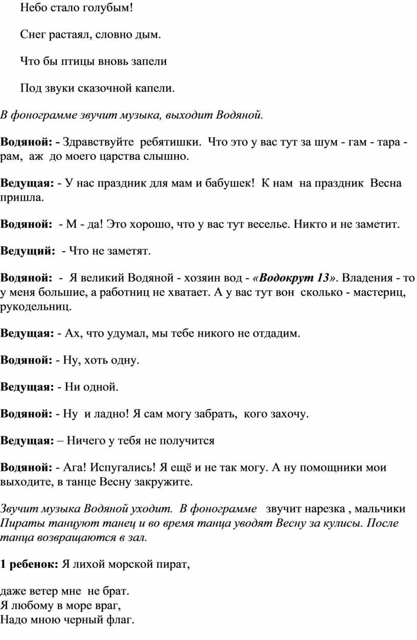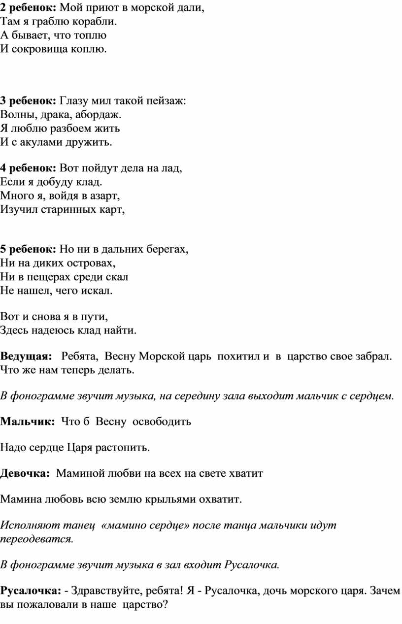 Звучит музыка Водяной уходит. В фонограмме звучит нарезка , мальчики Пираты танцуют танец и во время танца уводят Весну за кулисы. После танца возвращаются в зал.