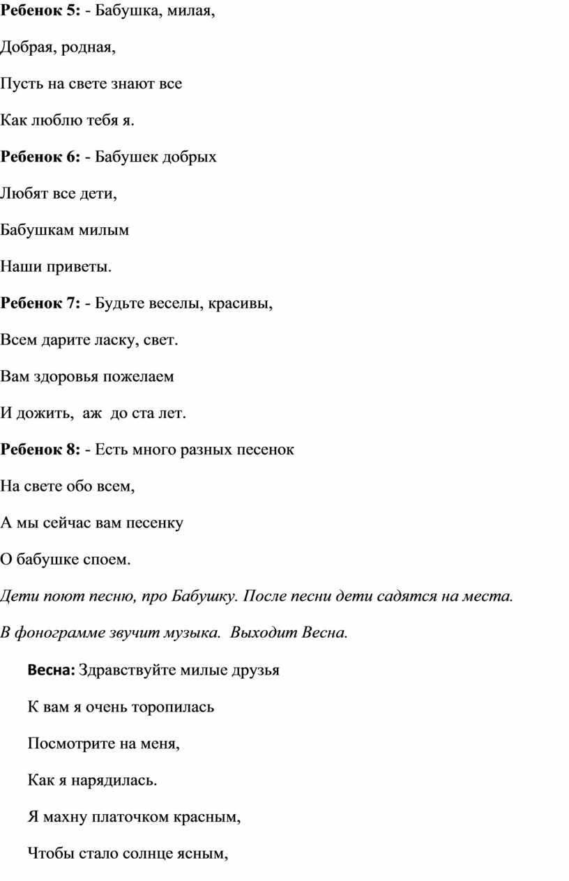 Ведущая: - У нас праздник для мам и бабушек! К нам на праздник Весна пришла.
