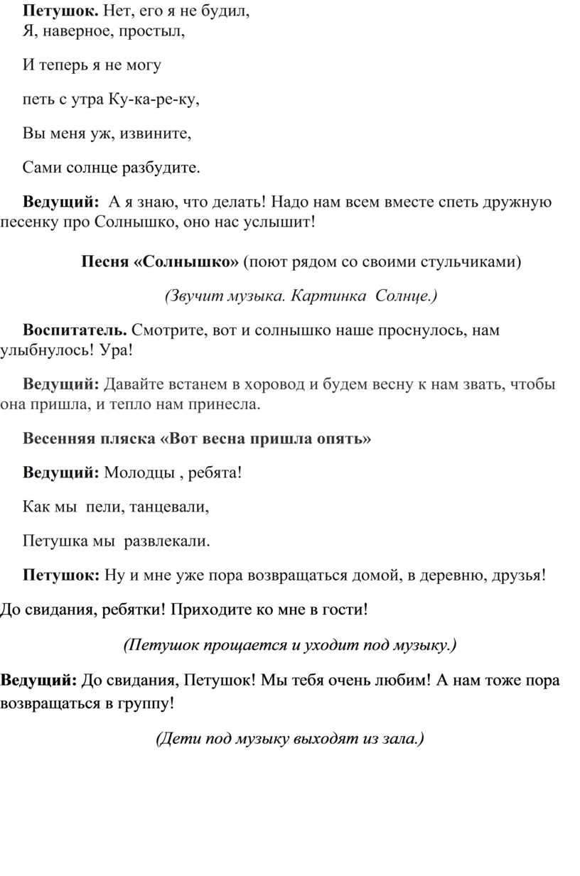 Ведущий: До свидания, Петушок! Мы тебя очень любим! А нам тоже пора возвращаться в группу!