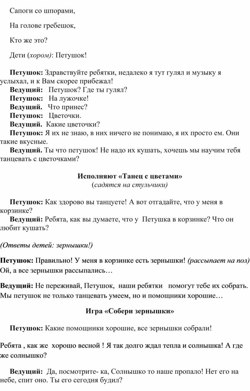 Ведущий. Ты что петушок! Не надо их кушать, хочешь мы научим тебя танцевать с цветочками?