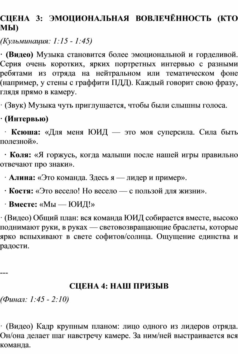 · (Видео) Музыка становится более эмоциональной и горделивой. Серия очень коротких, ярких портретных интервью с разными ребятами из отряда на нейтральном или тематическом фоне (например, у стены с граффити ПДД). Каждый говорит свою фразу, глядя прямо в камеру.