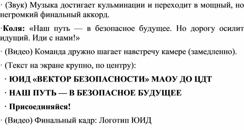 · (Видео) Общий план: вся команда ЮИД собирается вместе, высоко поднимают руки, в руках — световозвращающие браслеты, которые ярко вспыхивают в свете софитов/солнца. Ощущение единства и радости.