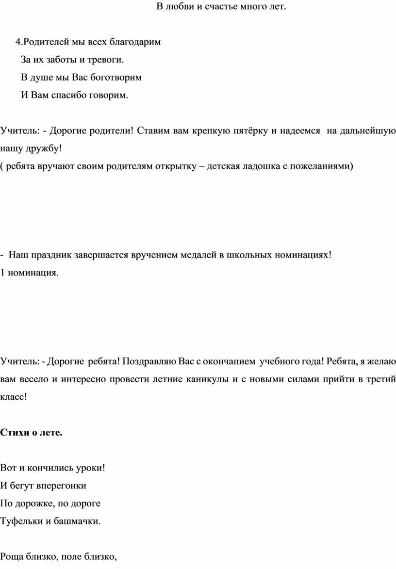 Учитель: - Дорогие ребята! Поздравляю Вас с окончанием учебного года! Ребята, я желаю вам весело и интересно провести летние каникулы и с новыми силами прийти в третий класс!