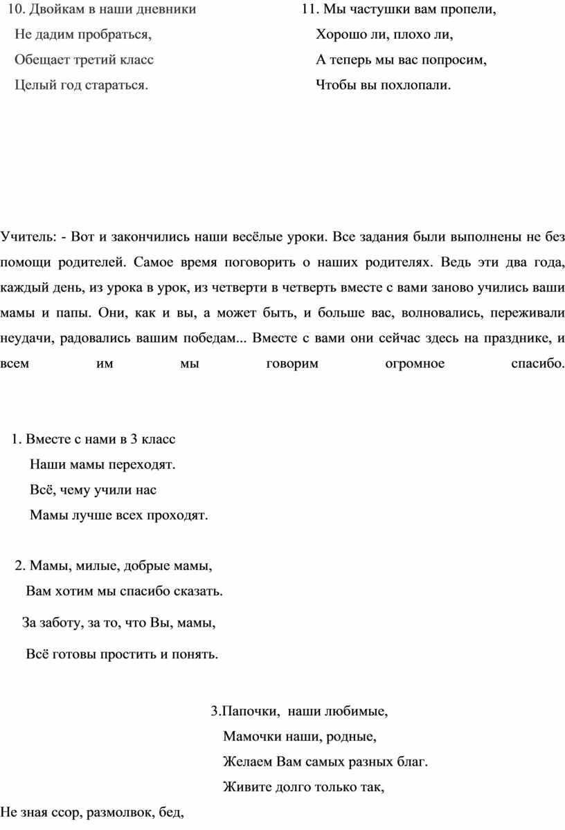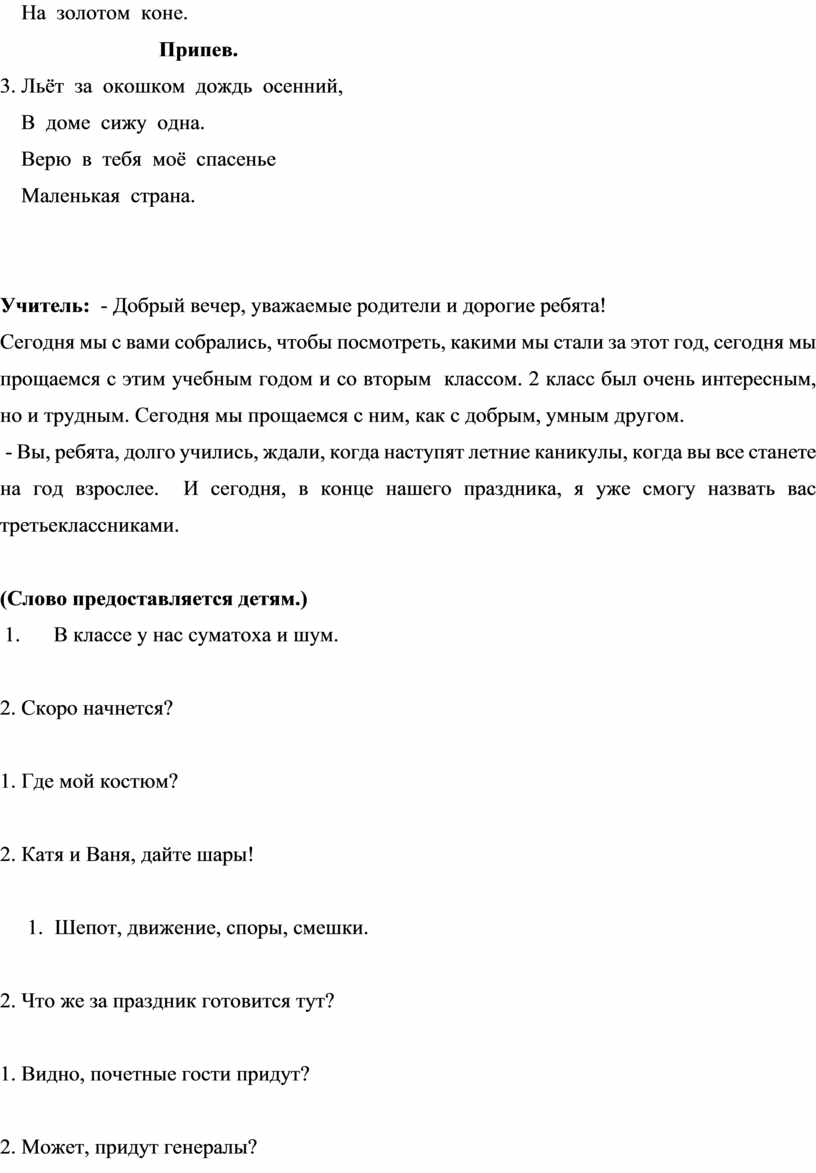 - Вы, ребята, долго учились, ждали, когда наступят летние каникулы, когда вы все станете на год взрослее. И сегодня, в конце нашего праздника, я уже смогу назвать вас третьеклассниками.