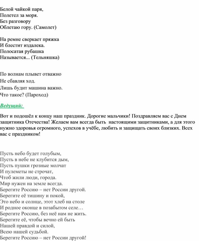 Ведущий: 23 февраля наша страна отмечает День защитника Отечества! Мы хорошо знаем, что мирное небо над головой, покой граждан страны, ее честь и достоинство защищают воины Российской Армии: солдаты, летчики и танкисты, пограничники и матросы.
