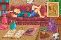 Идея для картинки: Мальчик лежит на кровати и смотрит в потолок, а вокруг него летают пузыри, символизирующие безделье. На заднем фоне можно нарисовать пыль на полках, показывающую, что он ничего не делает.
