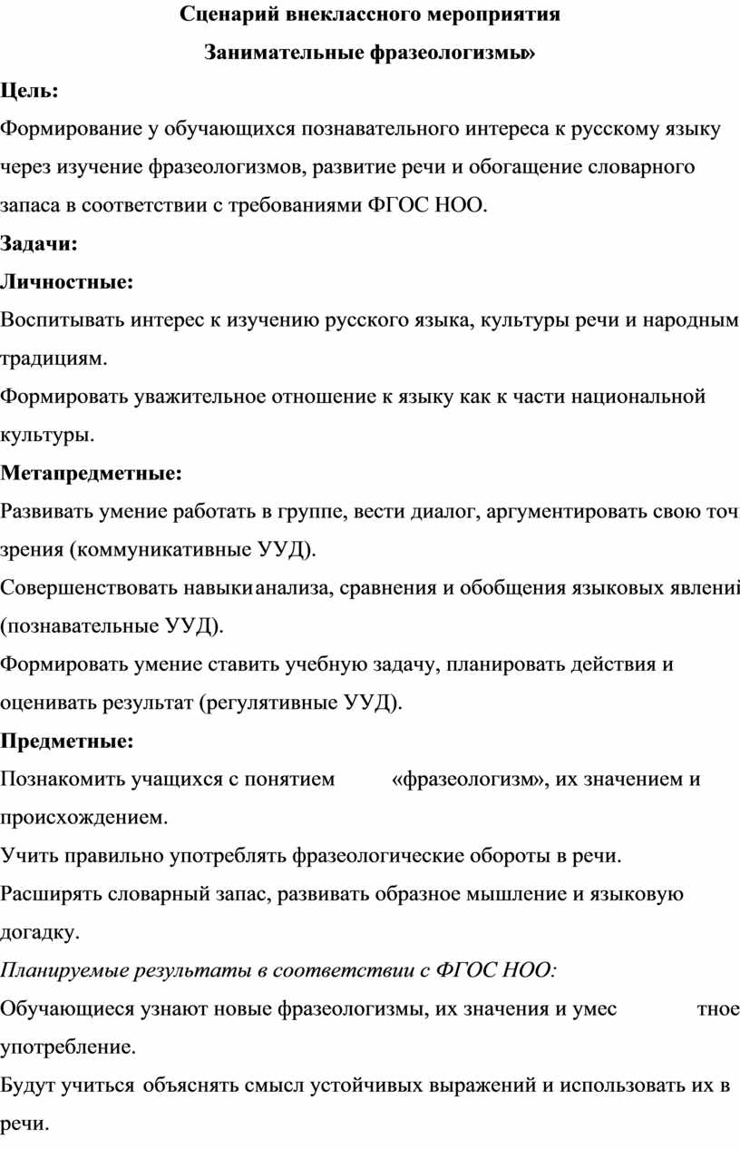 Формирование у обучающихся познавательного интереса к русскому языку через изучение фразеологизмов, развитие речи и обогащение словарного запаса в соответствии с требованиями ФГОС НОО.