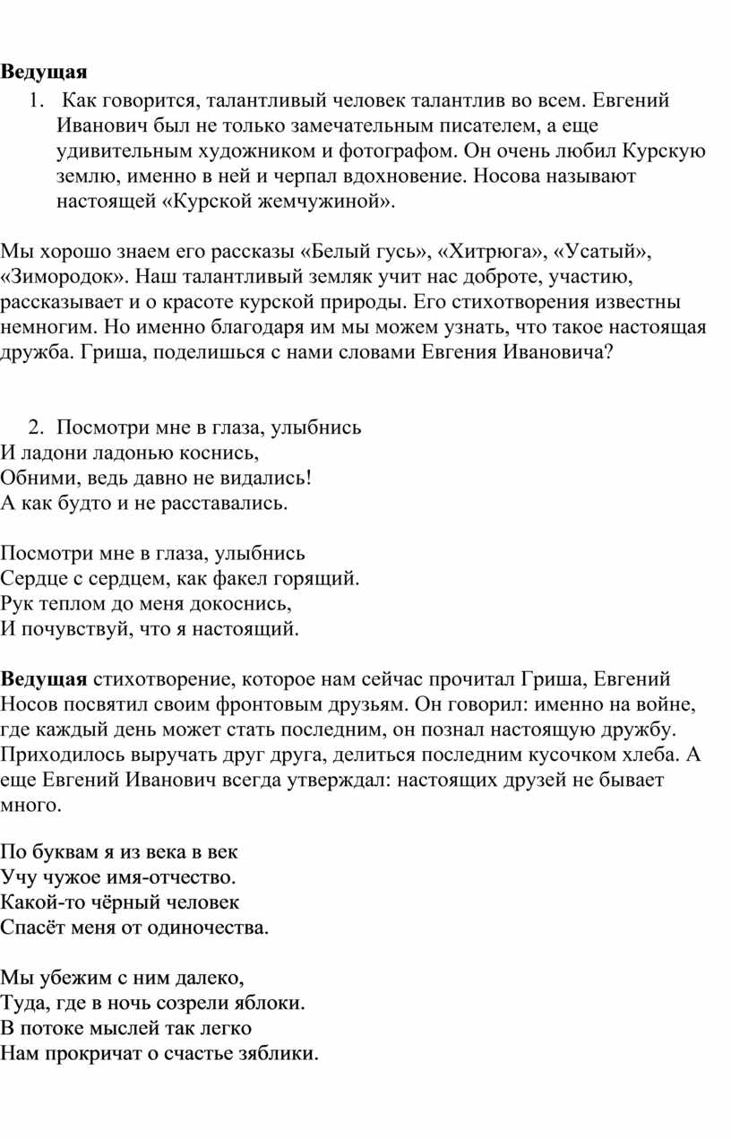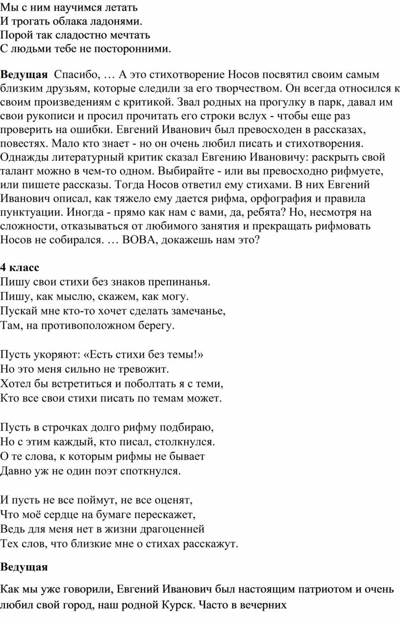 Ведущая Спасибо, … А это стихотворение Носов посвятил своим самым близким друзьям, которые следили за его творчеством. Он всегда относился к своим произведениям с критикой. Звал родных на прогулку в парк, давал им свои рукописи и просил прочитать его строки вслух - чтобы еще раз проверить на ошибки. Евгений Иванович был превосходен в рассказах, повестях. Мало кто знает - но он очень любил писать и стихотворения.