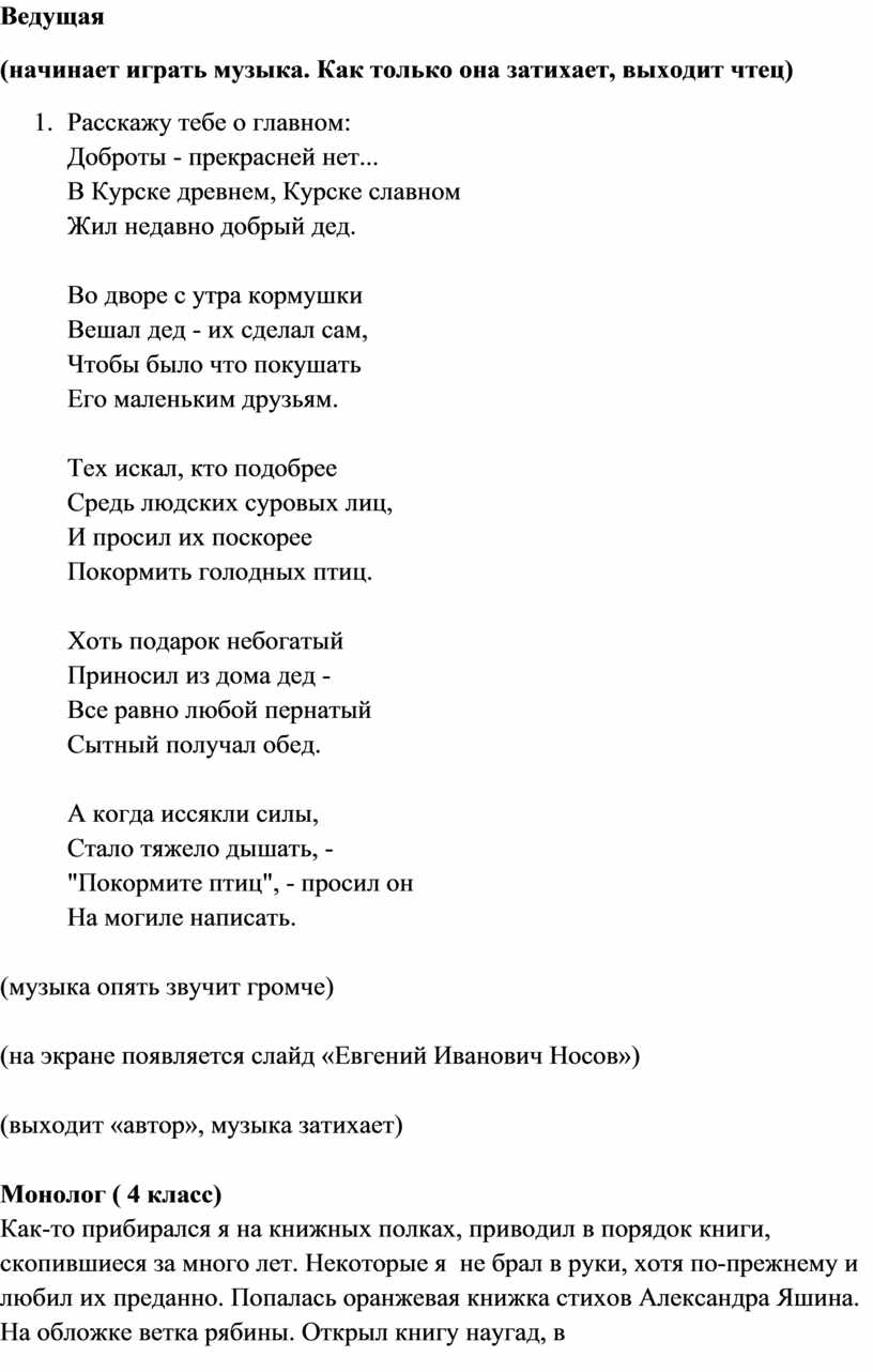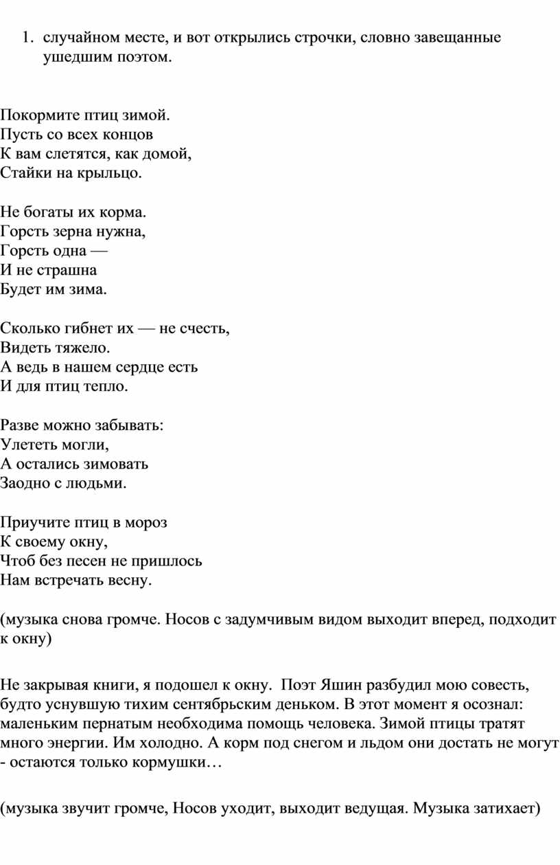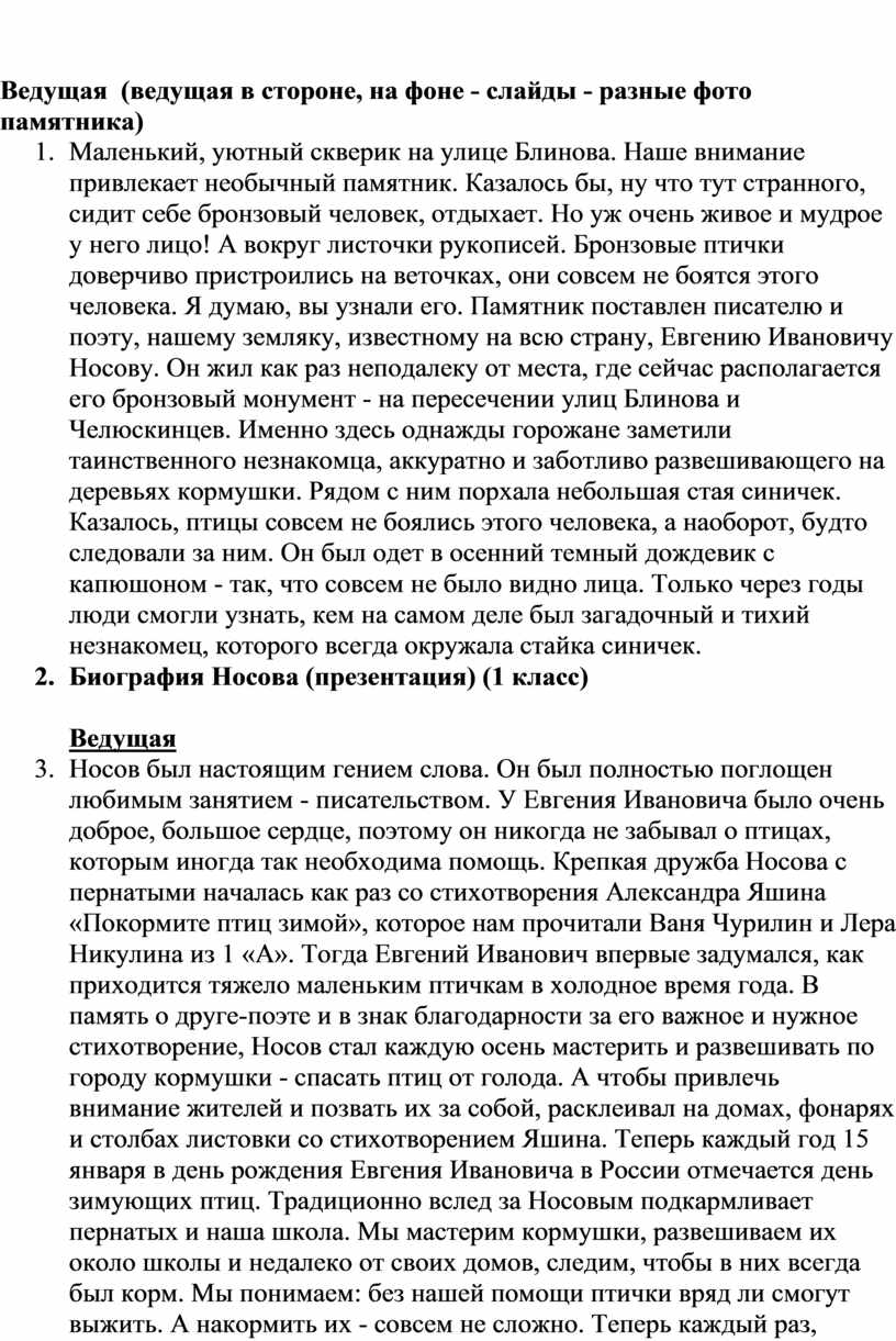 5. Носов был настоящим гением слова. Он был полностью поглощен любимым занятием - писательством. У Евгения Ивановича было очень доброе, большое сердце, поэтому он никогда не забывал о птицах, которым иногда так необходима помощь. Крепкая дружба Носова с пернатыми началась как раз со стихотворения Александра Яшина «Покормите птиц зимой», которое нам прочитали Ваня Чурилин и Лера Никулина из 1 «А». Тогда Евгений Иванович впервые задумался, как приходится тяжело маленьким птичкам в холодное время года. В память о друге-поэте и в знак благодарности за его важное и нужное стихотворение, Носов стал каждую осень мастерить и развешивать по городу кормушки - спасать птиц от голода. А чтобы привлечь внимание жителей и позвать их за собой, расклеивал на домах, фонарях и столбах листовки со стихотворением Яшина. Теперь каждый год 15 января в день рождения Евгения Ивановича в России отмечается день зимующих птиц. Традиционно вслед за Носовым подкармливает пернатых и наша школа. Мы мастерим кормушки, развешиваем их около школы и недалеко от своих домов, следим, чтобы в них всегда был корм. Мы понимаем: без нашей помощи птички вряд ли смогут выжить. А накормить их - совсем не сложно. Теперь каждый раз, проходя мимо школы и видя птичек, которые кушают из наших кормушек, мы невольно вспоминаем увлекательную жизнь Носова.