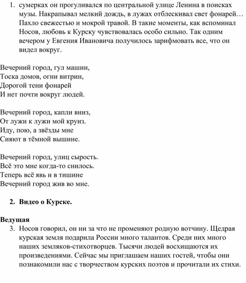 8. Как мы уже говорили, Евгений Иванович был настоящим патриотом и очень любил свой город, наш родной Курск. Часто в вечерних сумерках он прогуливался по центральной улице Ленина в поисках музы. Накрапывал мелкий дождь, в лужах отблескивал свет фонарей… Пахло свежестью и мокрой травой. В такие моменты, как вспоминал Носов, любовь к Курску чувствовалась особо сильно. Так одним вечером у Евгения Ивановича получилось зарифмовать все, что он видел вокруг.