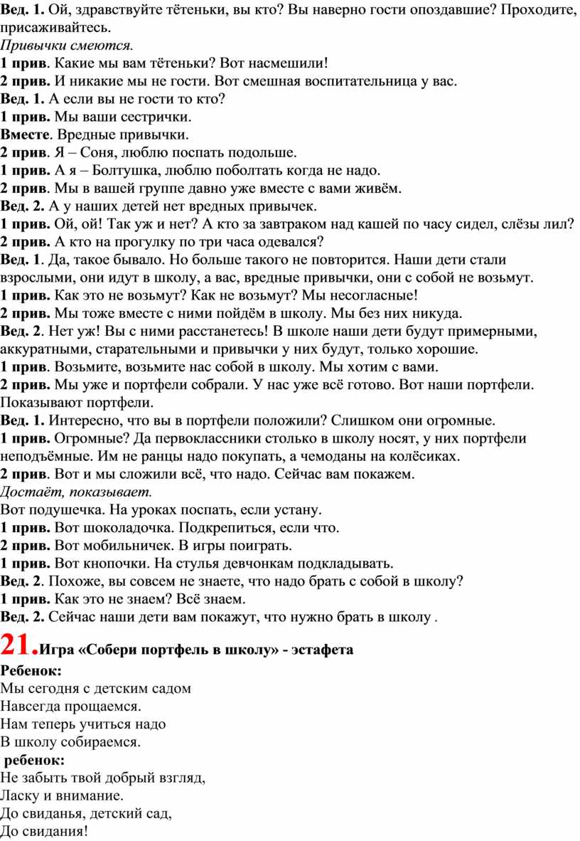 Ведущий 1: Хороших, умных детей вырастил наш детский сад. И сегодня все наши сотрудники желают вам, ребята, успехов в школе, хороших отметок, верных друзей. А ещё пожелания сегодня Вы услышите и от своих родителей…