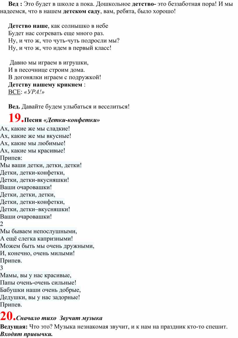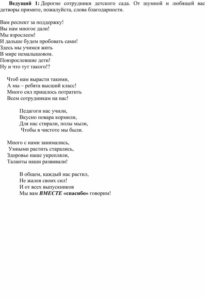 Ведущий 1: Дорогие сотрудники детского сада. От шумной и любящей вас детворы примите, пожалуйста, слова благодарности.