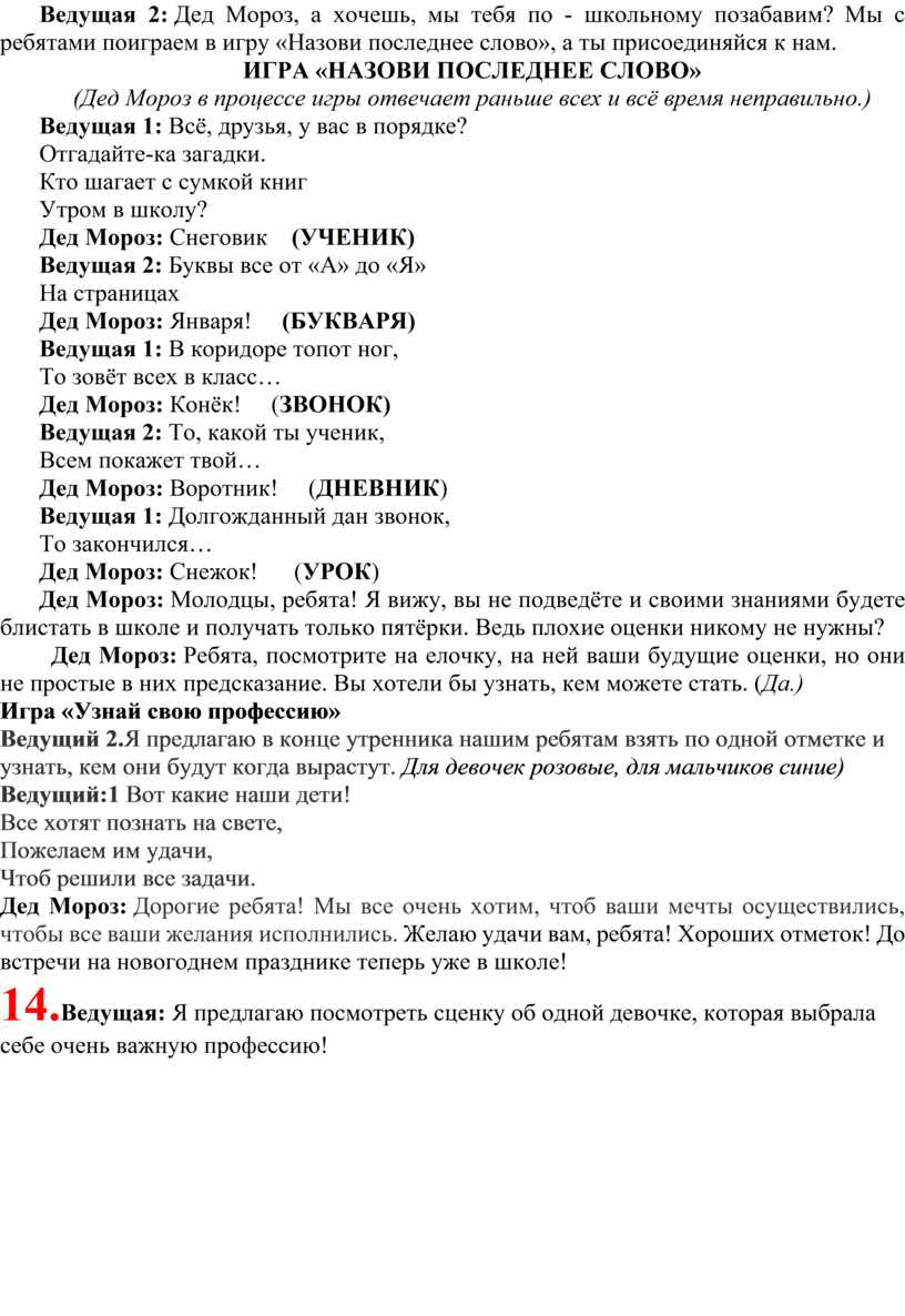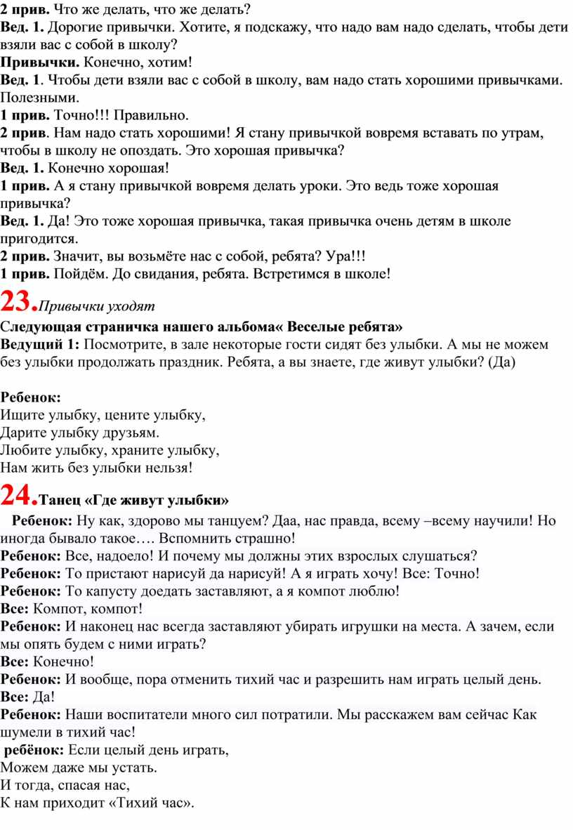 1.После 2 звонка в зал заходят 2 мал. и 2 дев. Начинают считать стулья, поправлять шарики.