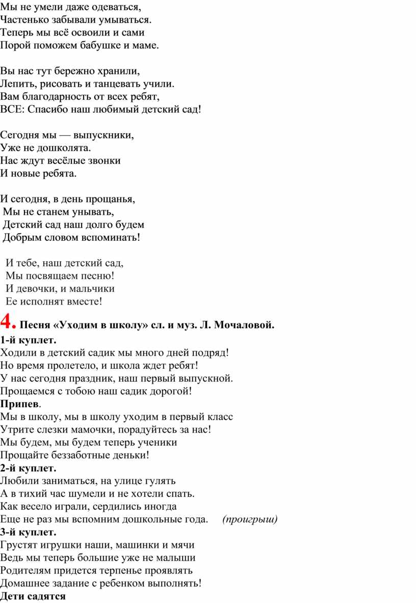 4. Песня «Уходим в школу» сл. и муз. Л. Мочаловой.