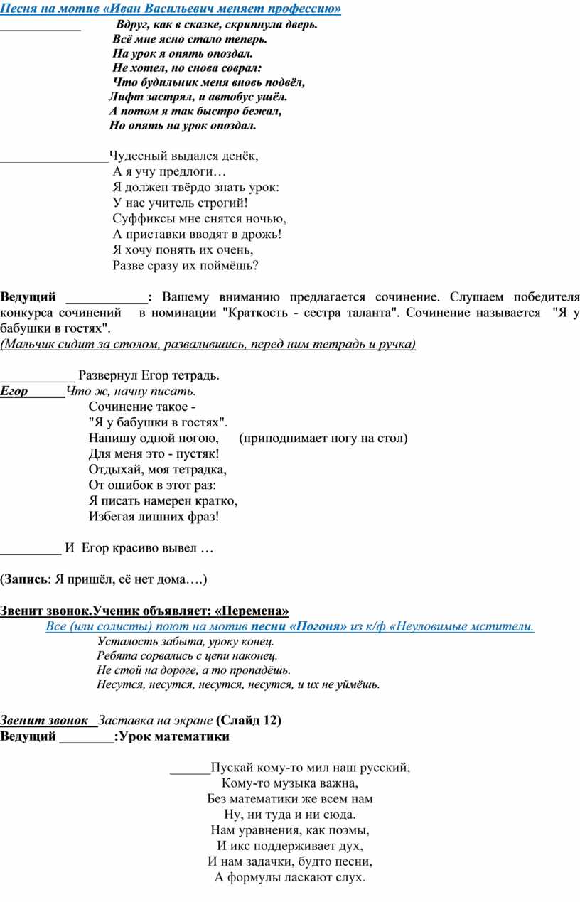 .Оборудование: компьютер, проектор, экран, микрофоны, презентация, музыка и фонограммы песен.