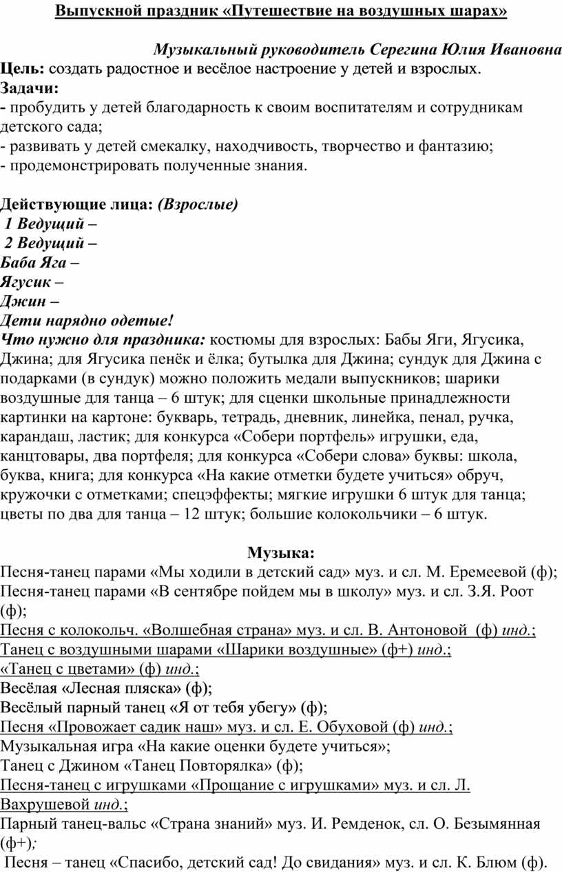 Что нужно для праздника: костюмы для взрослых: Бабы Яги, Ягусика, Джина; для Ягусика пенёк и ёлка; бутылка для Джина; сундук для Джина с подарками (в сундук) можно положить медали выпускников; шарики воздушные для танца – 6 штук; для сценки школьные принадлежности картинки на картоне: букварь, тетрадь, дневник, линейка, пенал, ручка, карандаш, ластик; для конкурса «Собери портфель» игрушки, еда, канцтовары, два портфеля; для конкурса «Собери слова» буквы: школа, буква, книга; для конкурса «На какие отметки будете учиться» обруч, кружочки с отметками; спецэффекты; мягкие игрушки 6 штук для танца; цветы по два для танца – 12 штук; большие колокольчики – 6 штук.