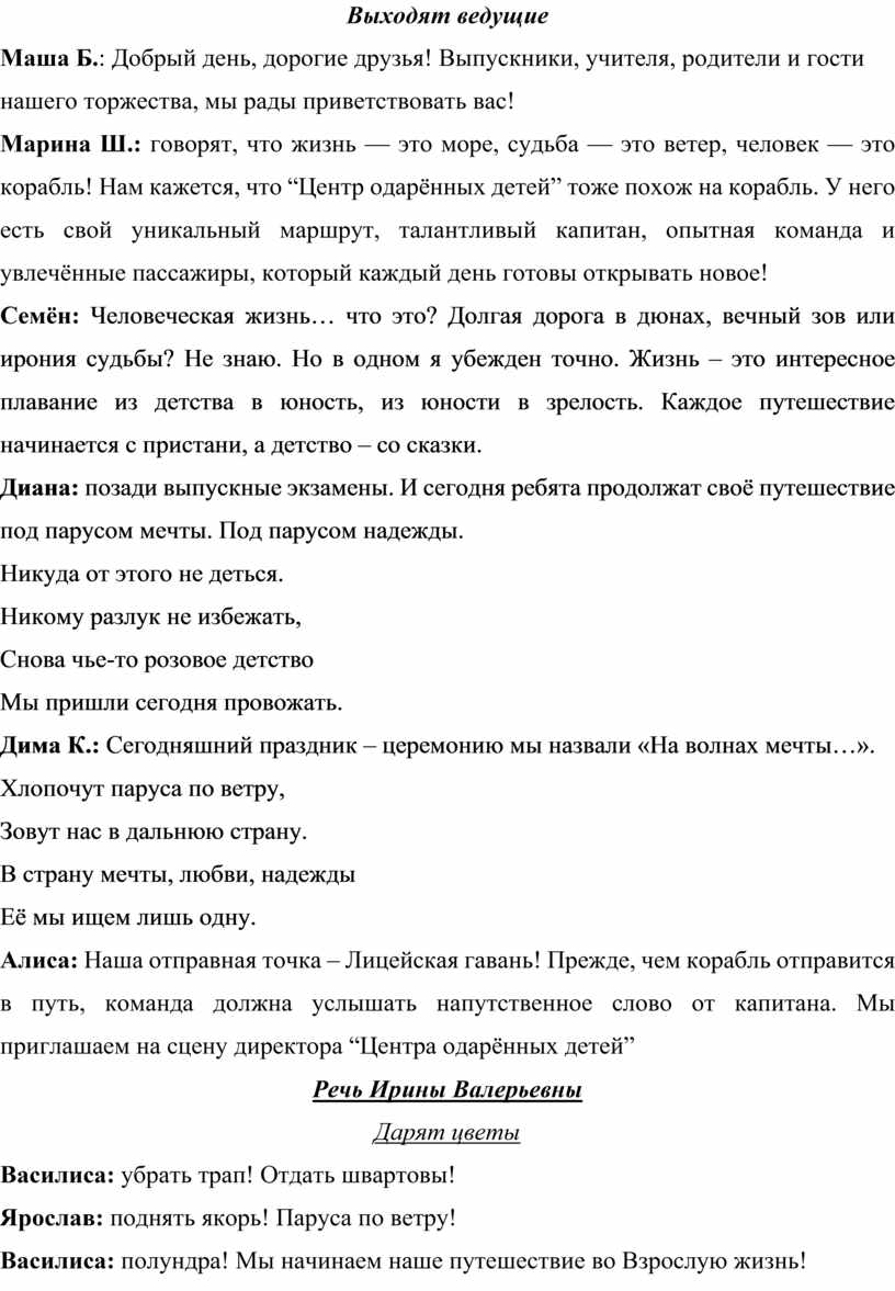 Алиса: Наша отправная точка – Лицейская гавань! Прежде, чем корабль отправится в путь, команда должна услышать напутственное слово от капитана. Мы приглашаем на сцену директора “Центра одарённых детей”