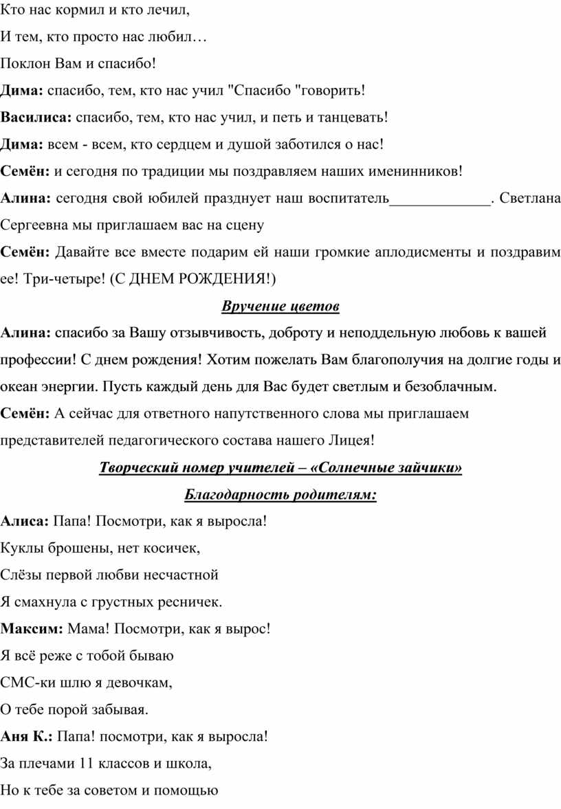 Семён: А сейчас для ответного напутственного слова мы приглашаем представителей педагогического состава нашего Лицея!