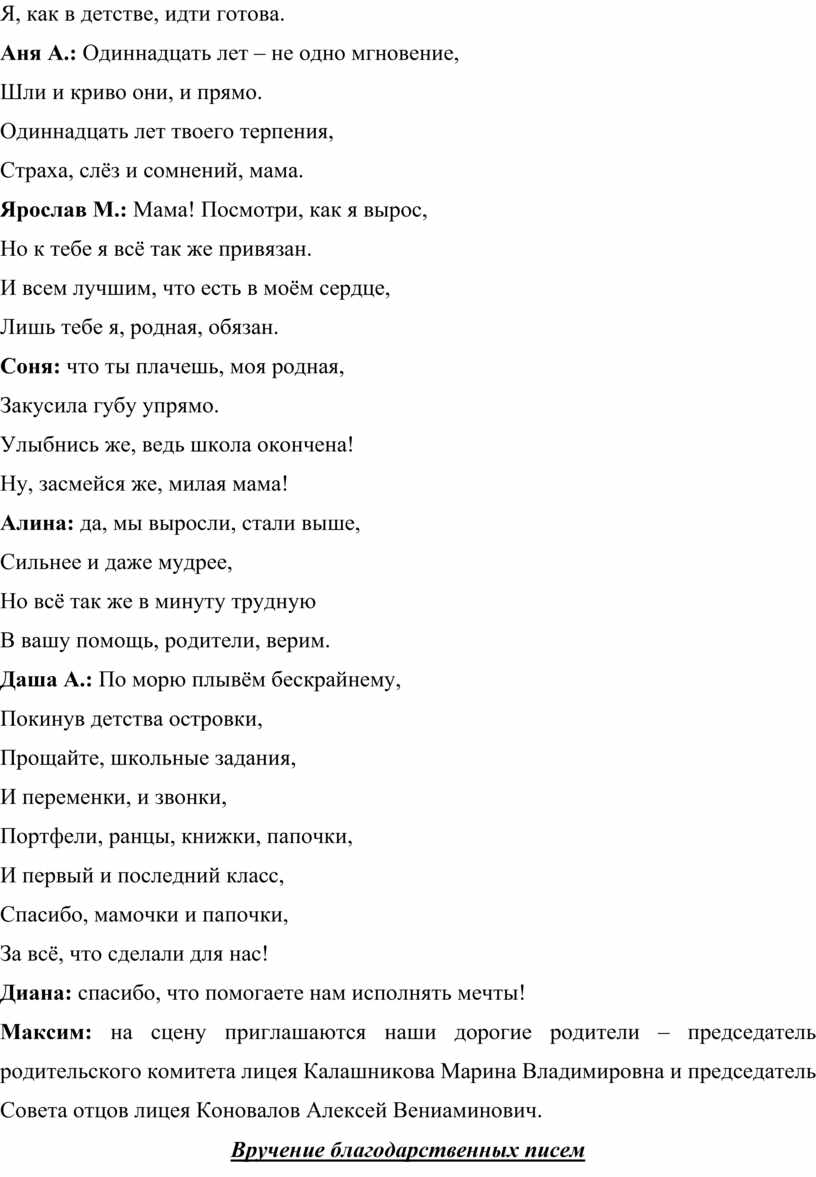 Максим: на сцену приглашаются наши дорогие родители – председатель родительского комитета лицея Калашникова Марина Владимировна и председатель Совета отцов лицея Коновалов Алексей Вениаминович.
