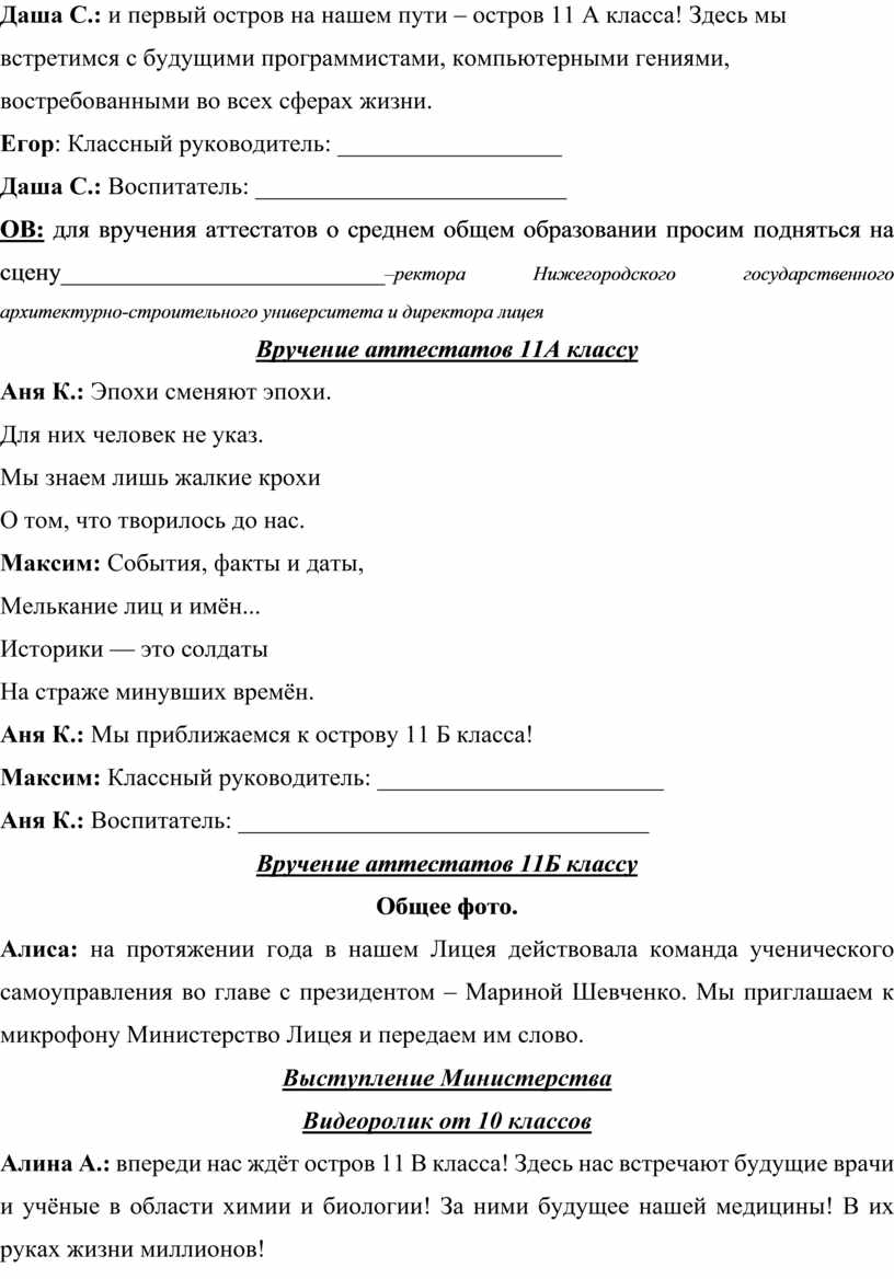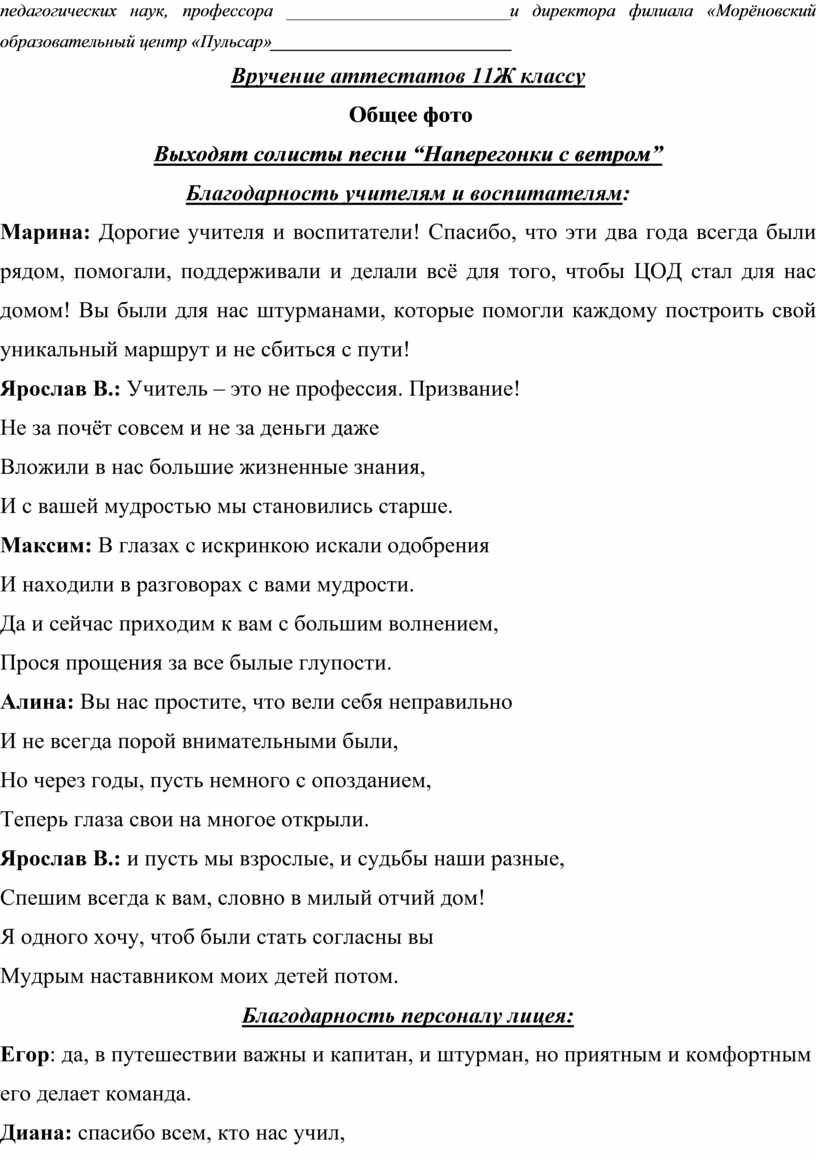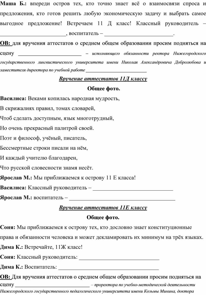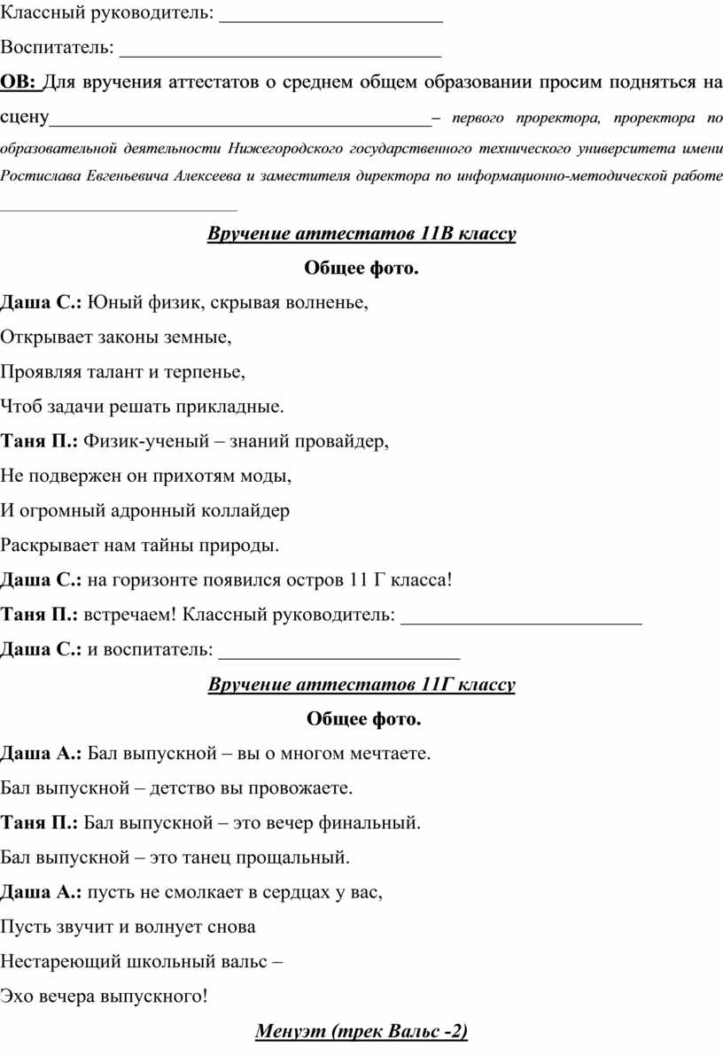 ОВ: Для вручения аттестатов о среднем общем образовании просим подняться на сцену _________________________________ – проректора по учебно-методической деятельности Нижегородского государственного педагогического университета имени Козьмы Минина, доктора педагогических наук, профессора _________________________и директора филиала «Морёновский образовательный центр «Пульсар»___________________________