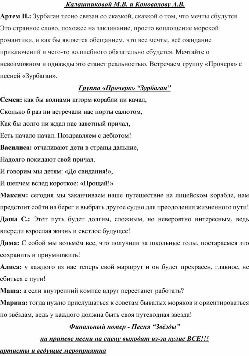 Артем Н.: Зурбаган тесно связан со сказкой, сказкой о том, что мечты сбудутся. Это странное слово, похожее на заклинание, просто воплощение морской романтики, и как бы является обещанием, что все мечты, всё ожидание приключений и чего-то волшебного обязательно сбудется. Мечтайте о невозможном и однажды это станет реальностью. Встречаем группу «Прочерк» с песней «Зурбаган».