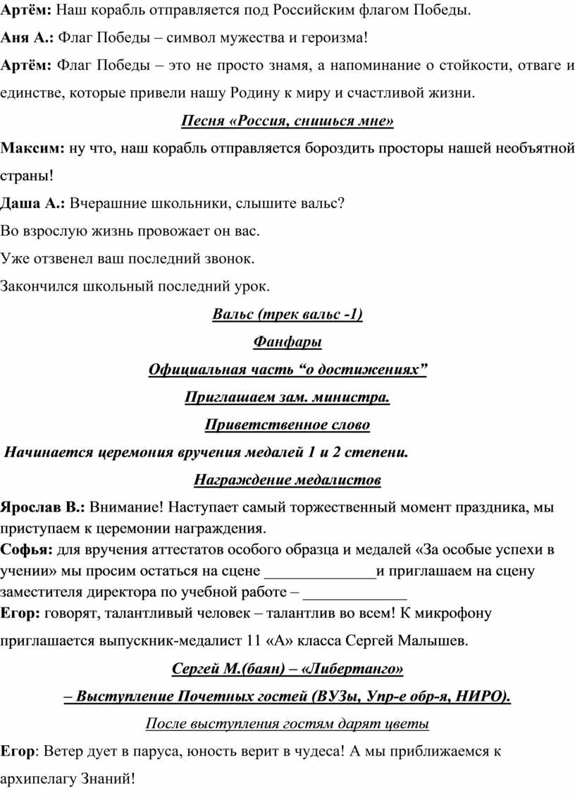 Софья: для вручения аттестатов особого образца и медалей «За особые успехи в учении» мы просим остаться на сцене ______________и приглашаем на сцену заместителя директора по учебной работе – _____________