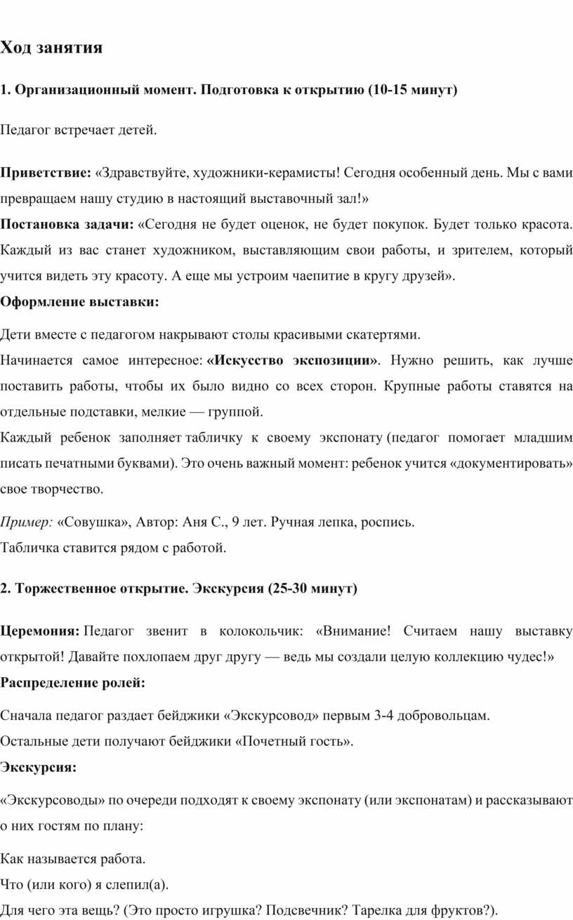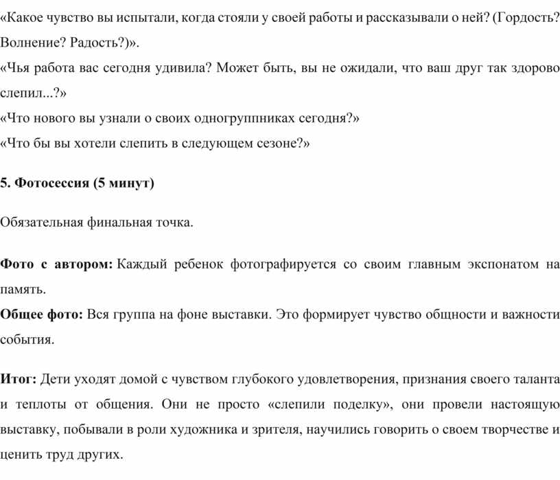 Итог: Дети уходят домой с чувством глубокого удовлетворения, признания своего таланта и теплоты от общения. Они не просто «слепили поделку», они провели настоящую выставку, побывали в роли художника и зрителя, научились говорить о своем творчестве и ценить труд других.