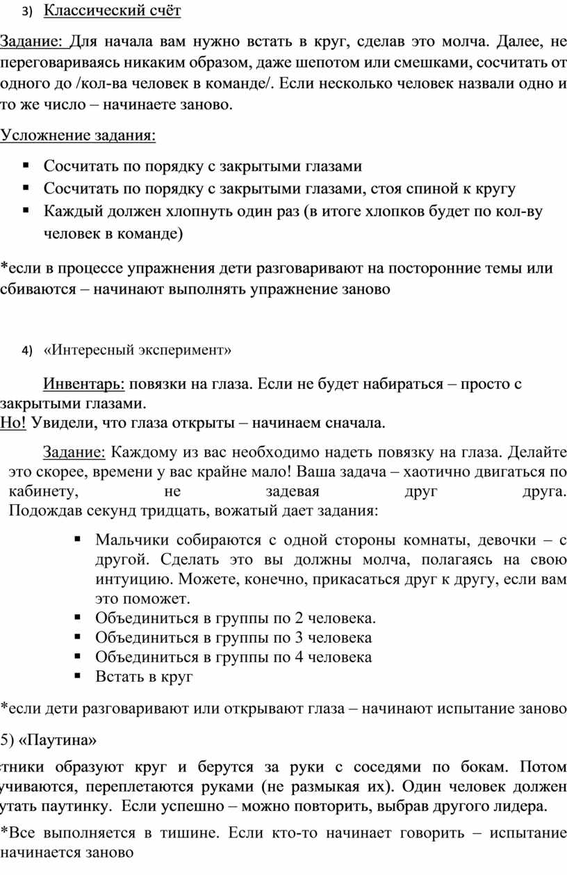 Задание: Для начала вам нужно встать в круг, сделав это молча. Далее, не переговариваясь никаким образом, даже шепотом или смешками, сосчитать от одного до /кол-ва человек в команде/. Если несколько человек назвали одно и то же число – начинаете заново.