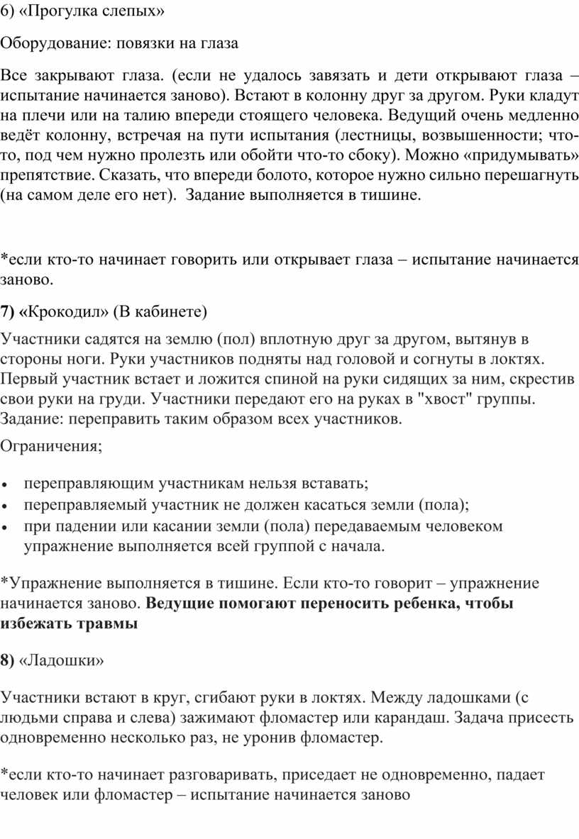 Все закрывают глаза. (если не удалось завязать и дети открывают глаза –испытание начинается заново). Встают в колонну друг за другом. Руки кладут на плечи или на талию впереди стоящего человека. Ведущий очень медленно ведёт колонну, встречая на пути испытания (лестницы, возвышенности; что-то, под чем нужно пролезть или обойти что-то сбоку). Можно «придумывать» препятствие. Сказать, что впереди болото, которое нужно сильно перешагнуть (на самом деле его нет). Задание выполняется в тишине.