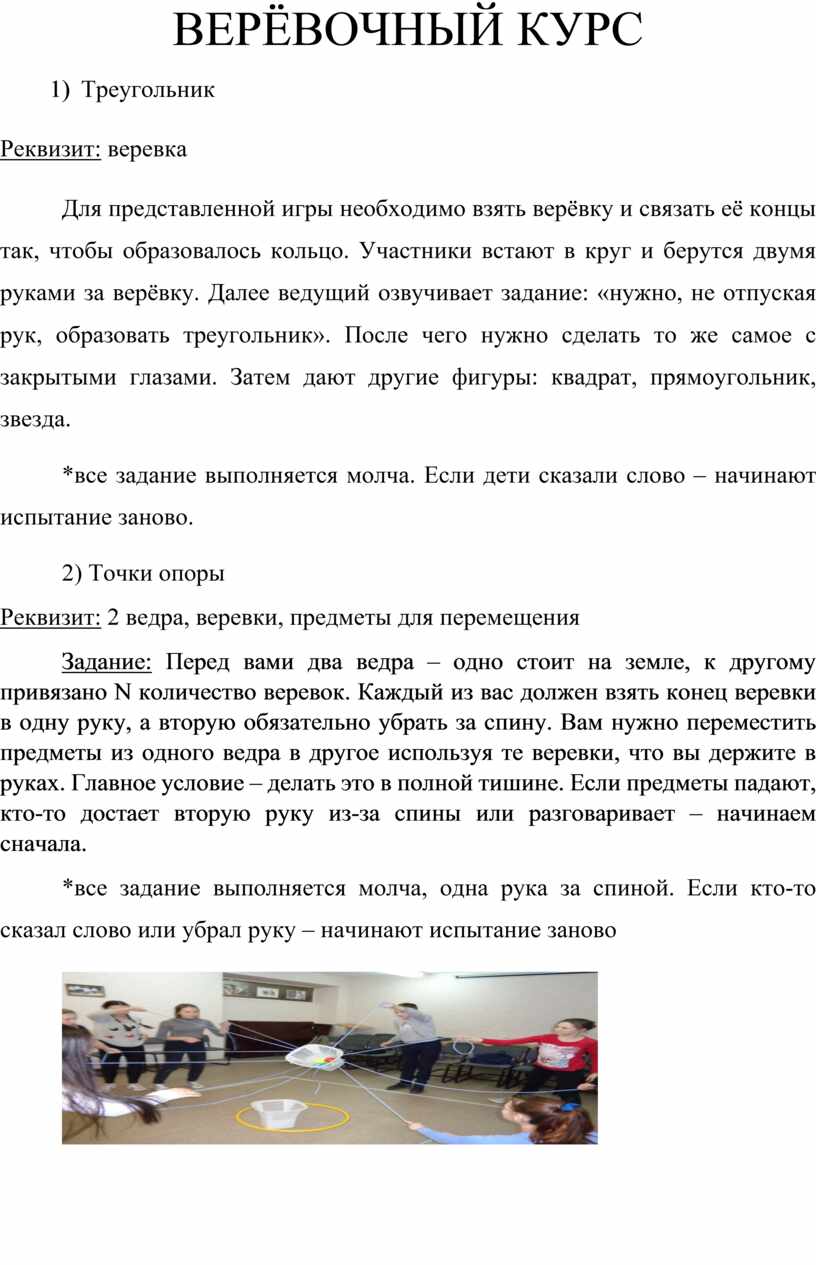 Задание: Перед вами два ведра – одно стоит на земле, к другому привязано N количество веревок. Каждый из вас должен взять конец веревки в одну руку, а вторую обязательно убрать за спину. Вам нужно переместить предметы из одного ведра в другое используя те веревки, что вы держите в руках. Главное условие – делать это в полной тишине. Если предметы падают, кто-то достает вторую руку из-за спины или разговаривает – начинаем сначала.