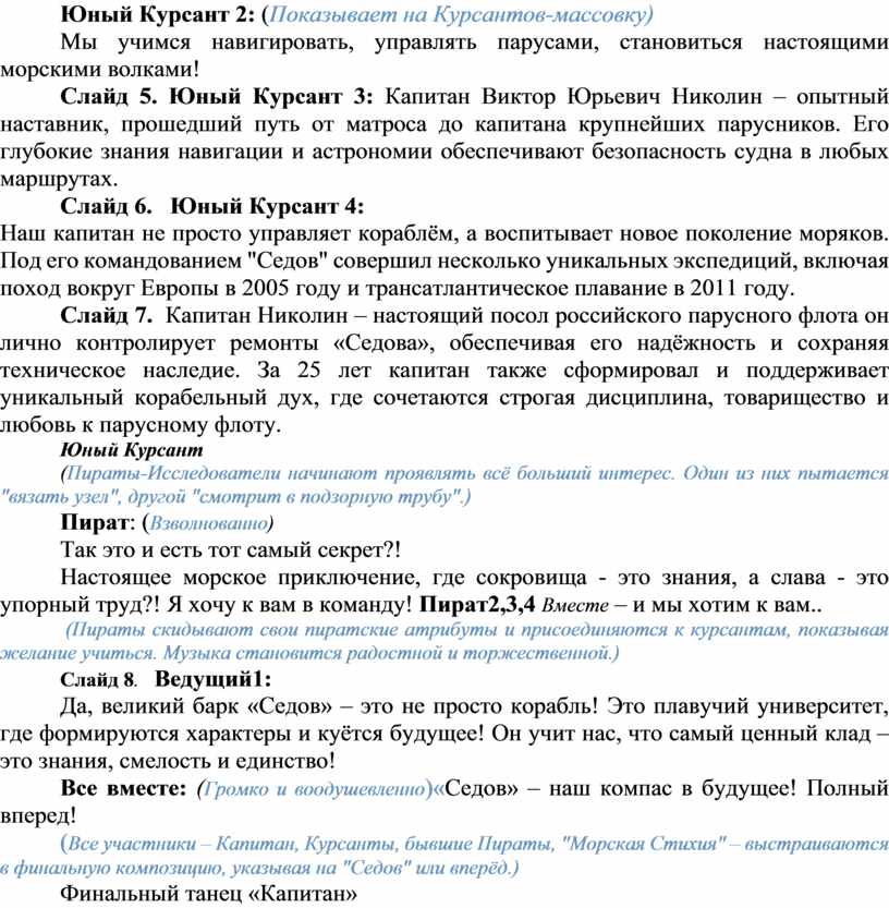 (Музыка становится более энергичной, но сохраняет морскую тематику. На сцену выходит Капитан «Седова» и несколько Курсантов.)