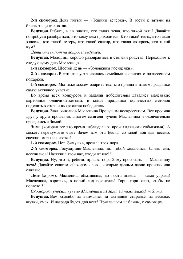 1й скоморох. Пора пятницу объявлять.2й скоморох. День пятый — «Тещины вечерки». В гости к зятьям на